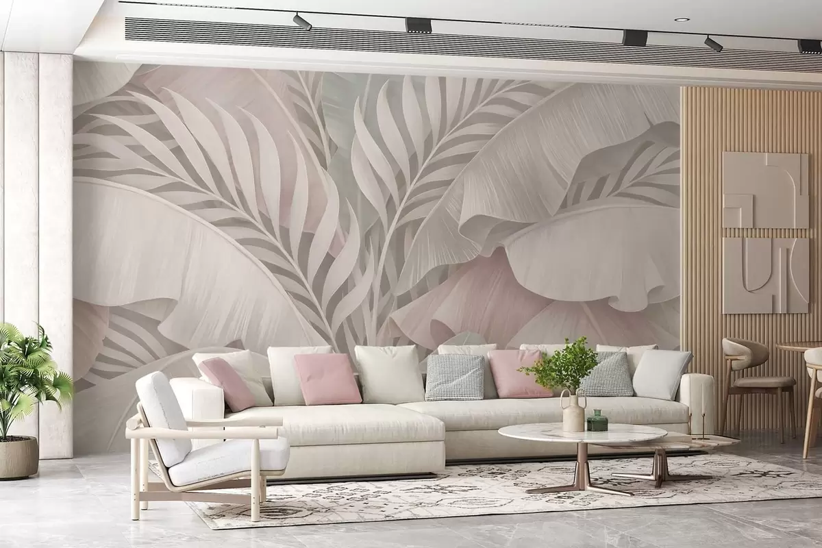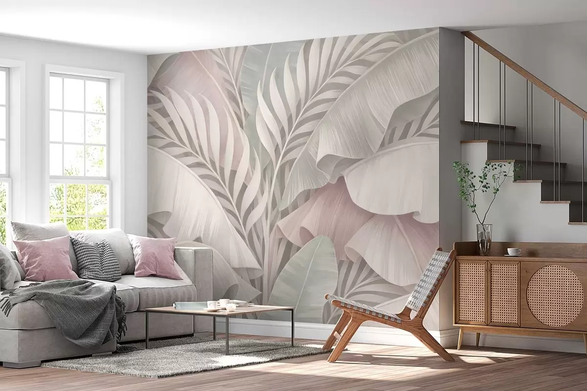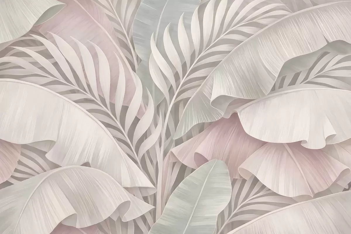 Фототапет големи тропически листа в хладни нюанси на розово и сиво Nr w05062v1
