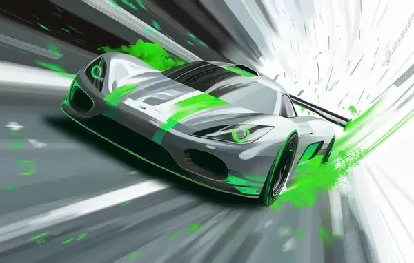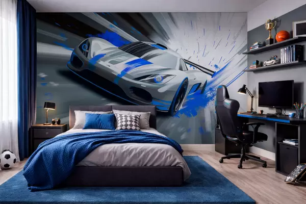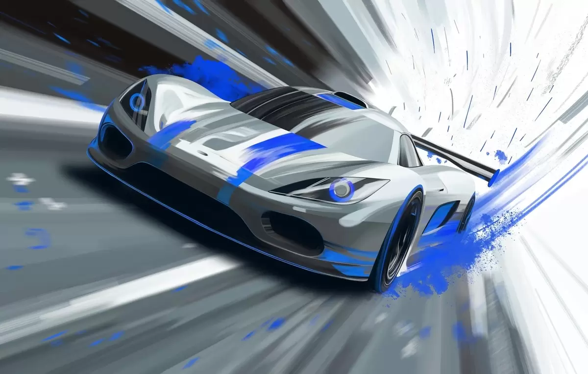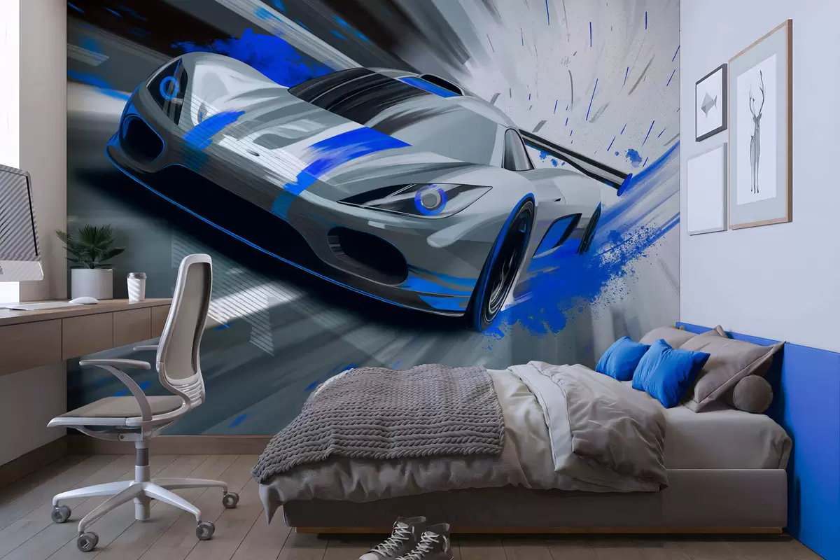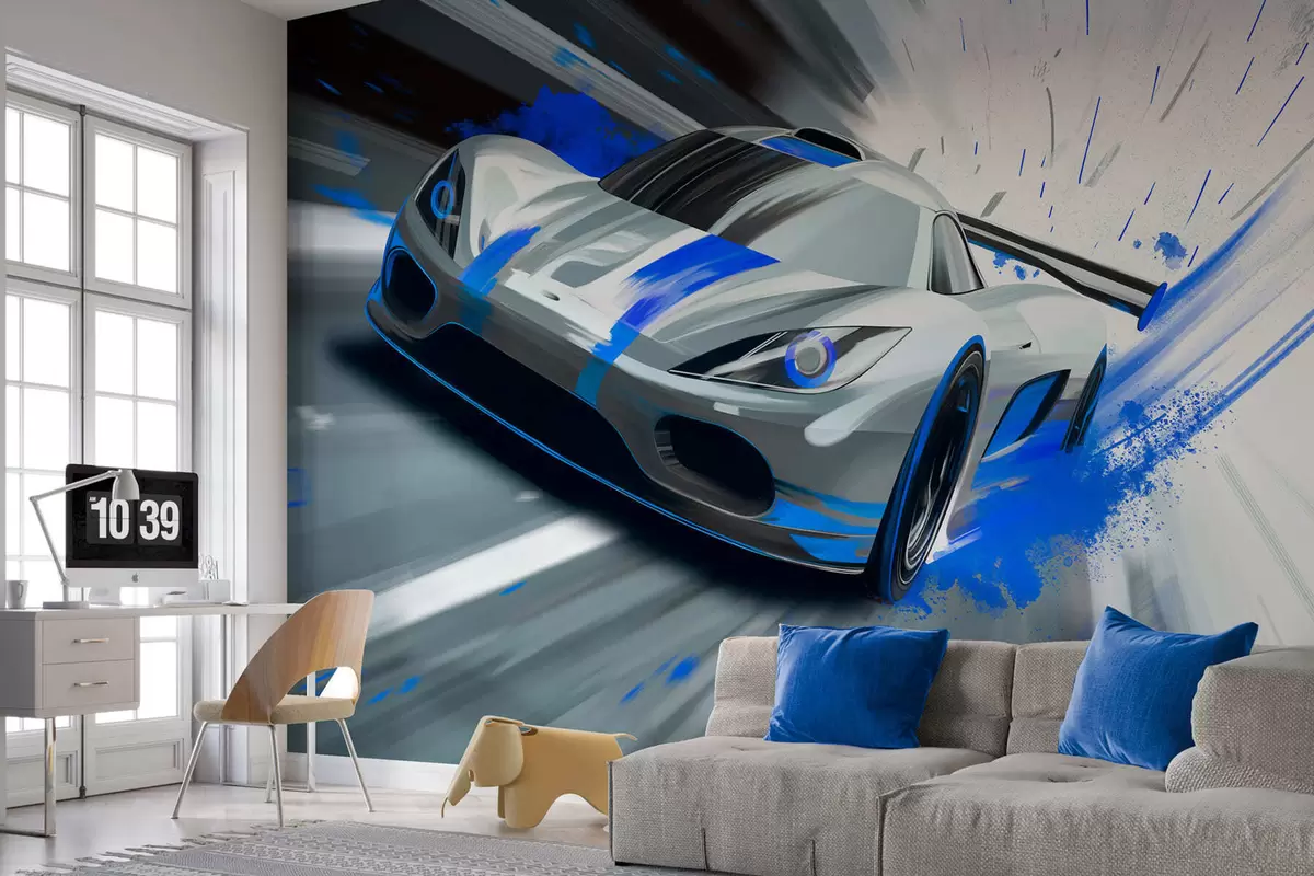 Фототапет динамичен спортен автомобил в стил дигитална рисунка със сини акценти Nr w05069