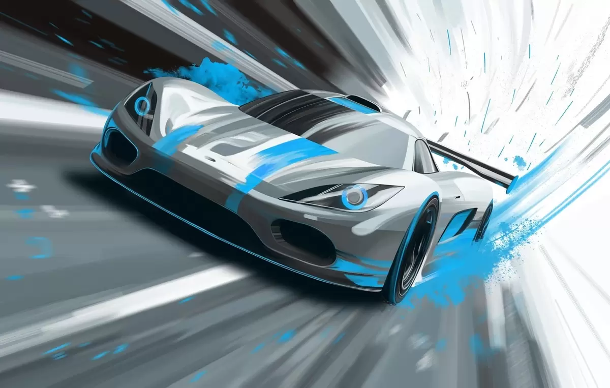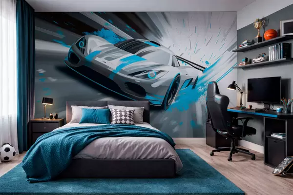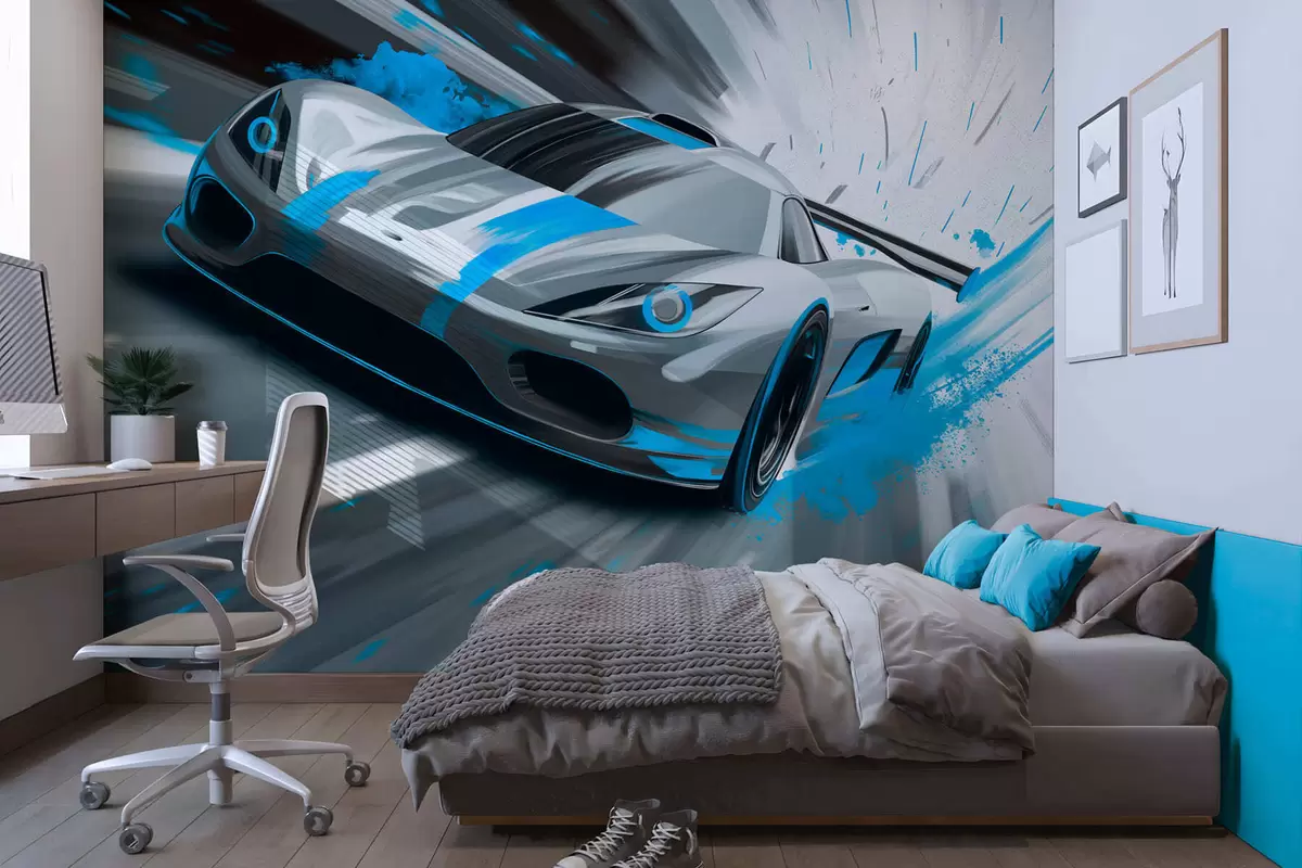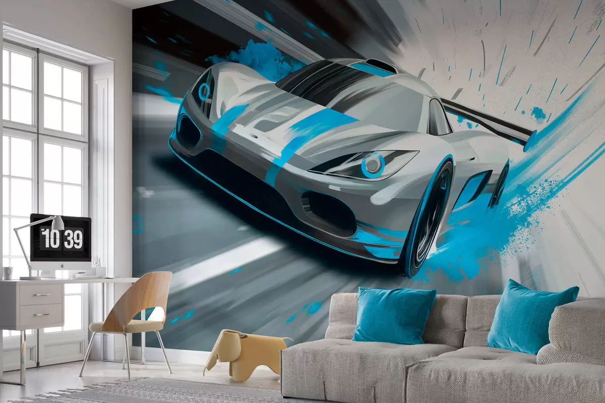 Фототапет динамичен спортен автомобил в стил цифрово рисуване с тюркоазени акценти Nr w05069v3