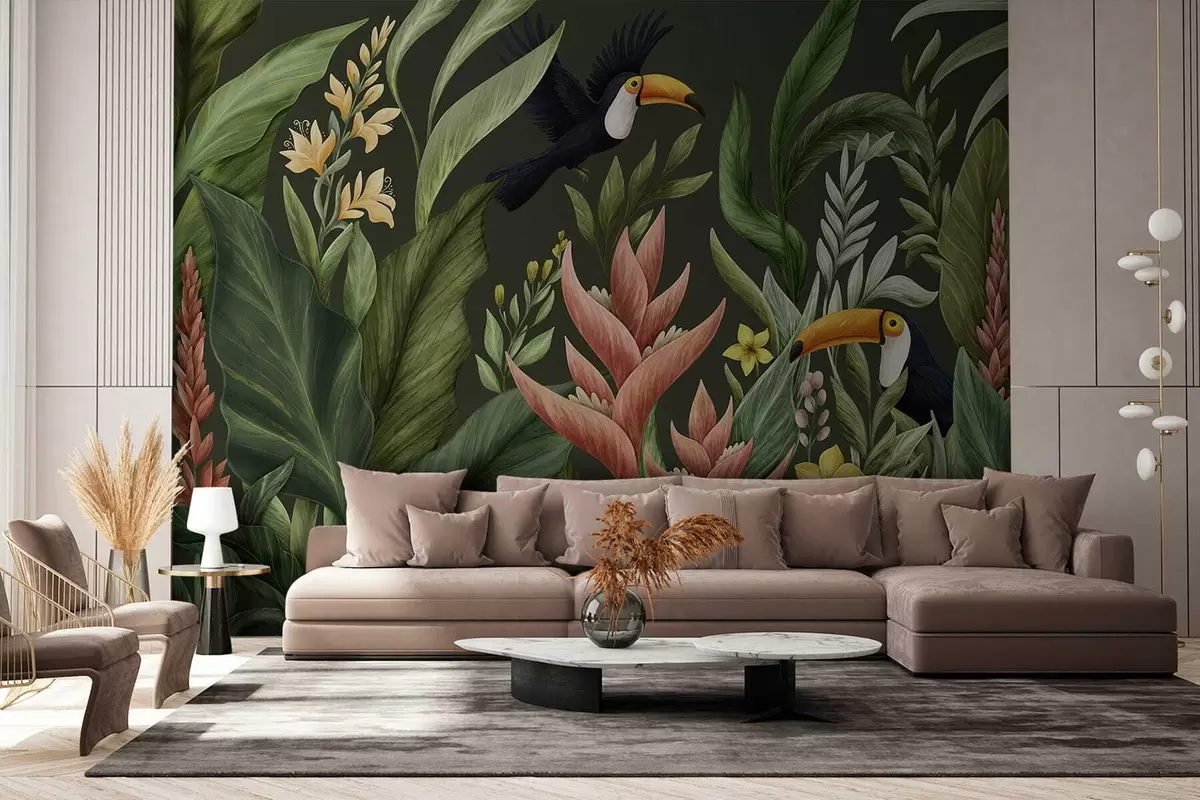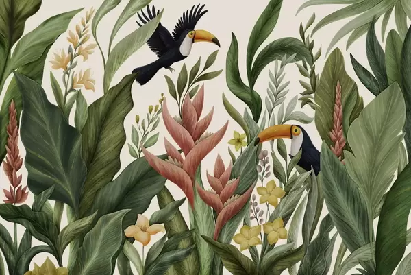 Фототапет Тропически растения и птици с големи клюнове на светъл фон Nr w05088