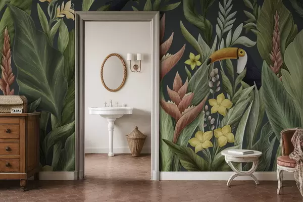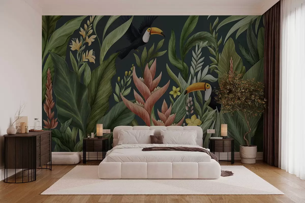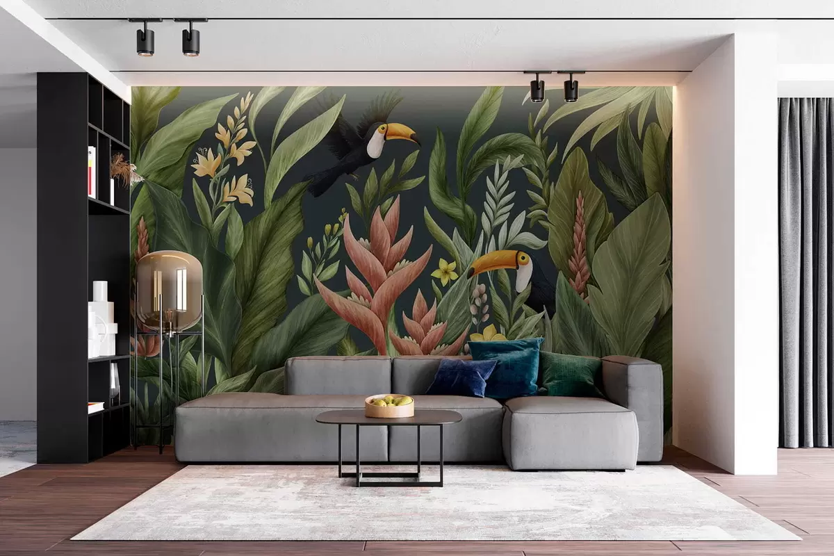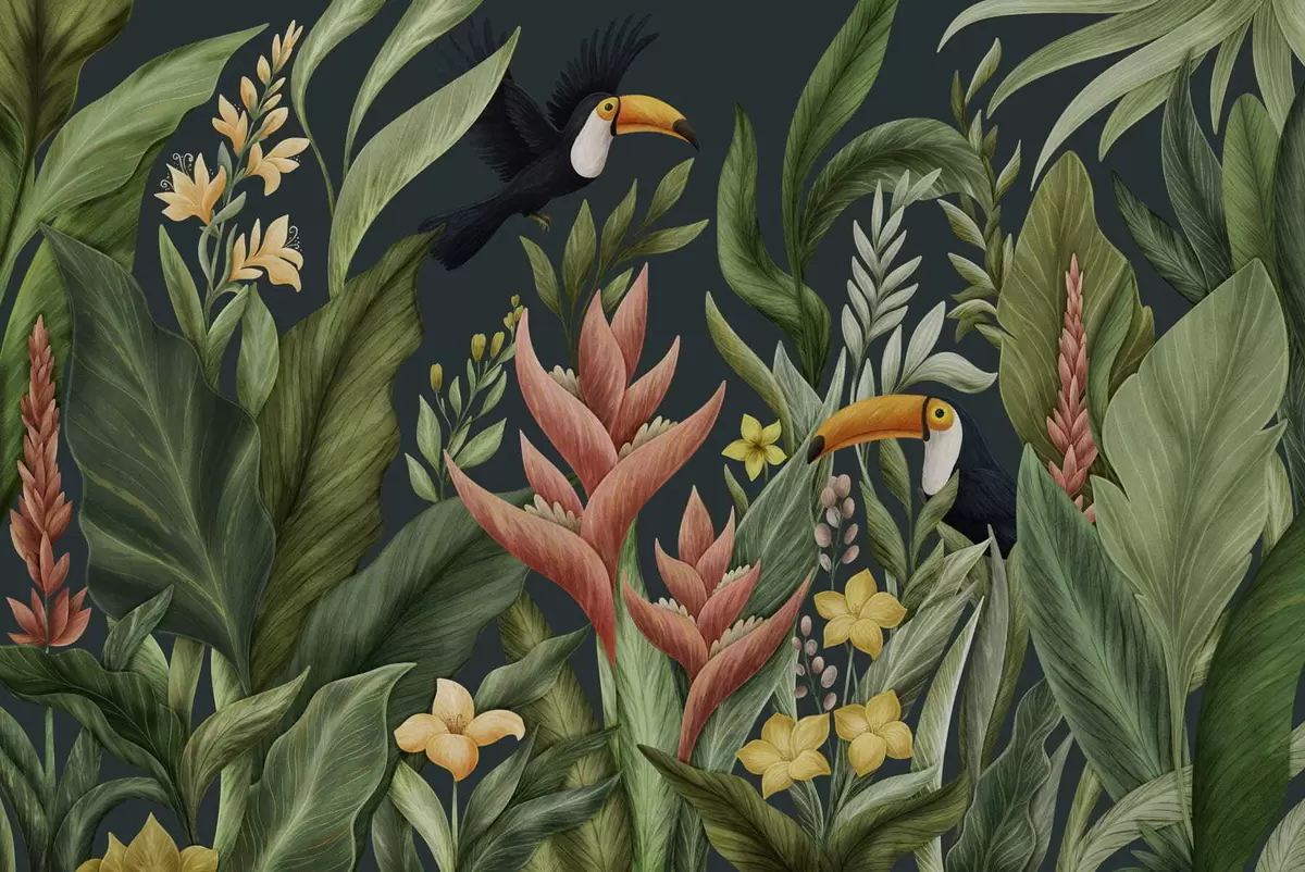 Фототапет Тропически растения и птици с големи клюнове на тъмен фон Nr w05088v2
