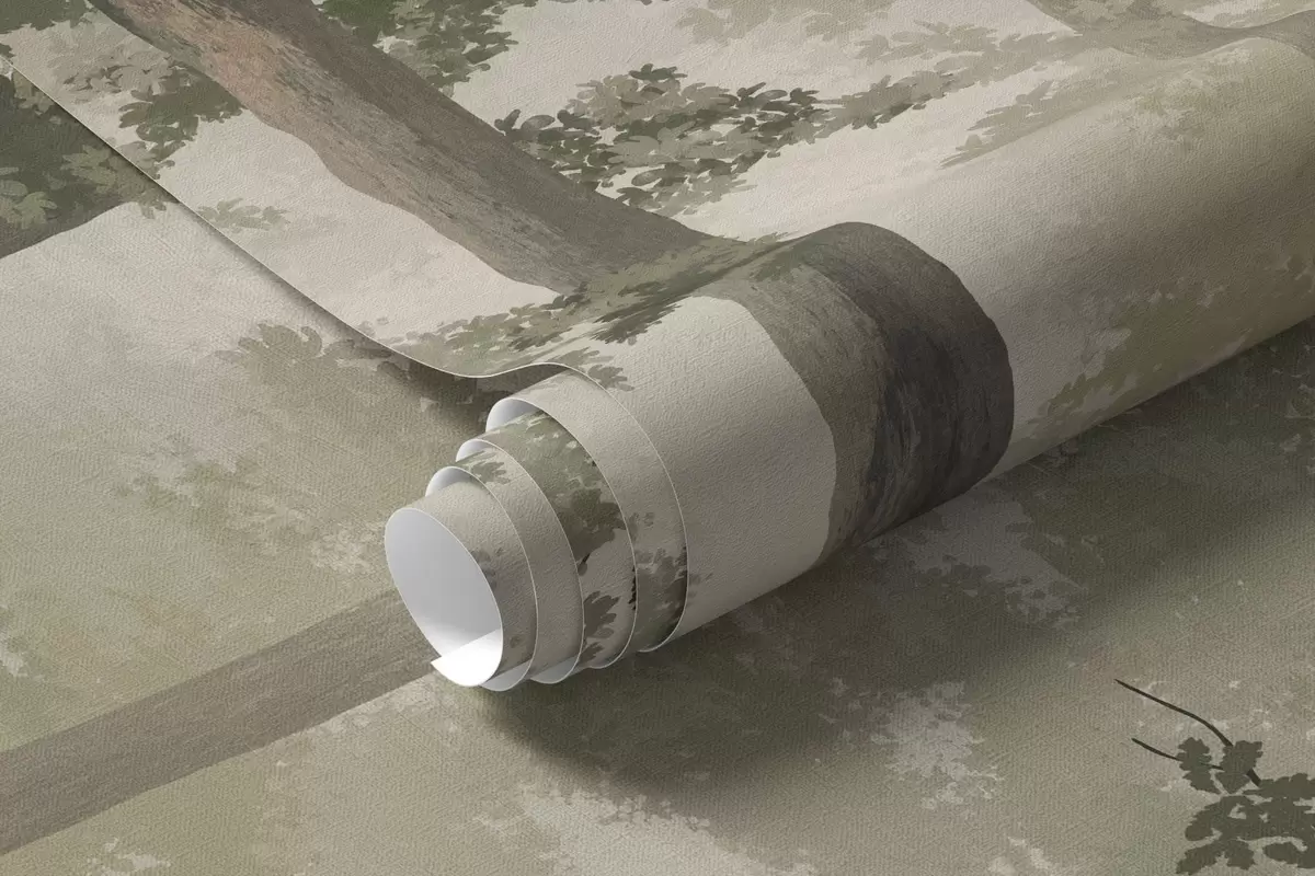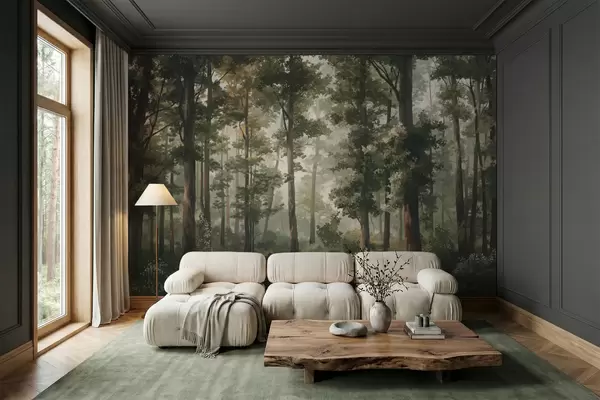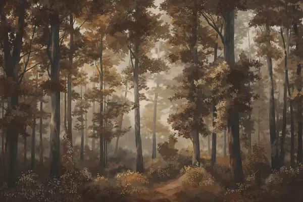 Фототапет Илюстрация на гора с мъгла, високи дървета и пътека Nr w05089