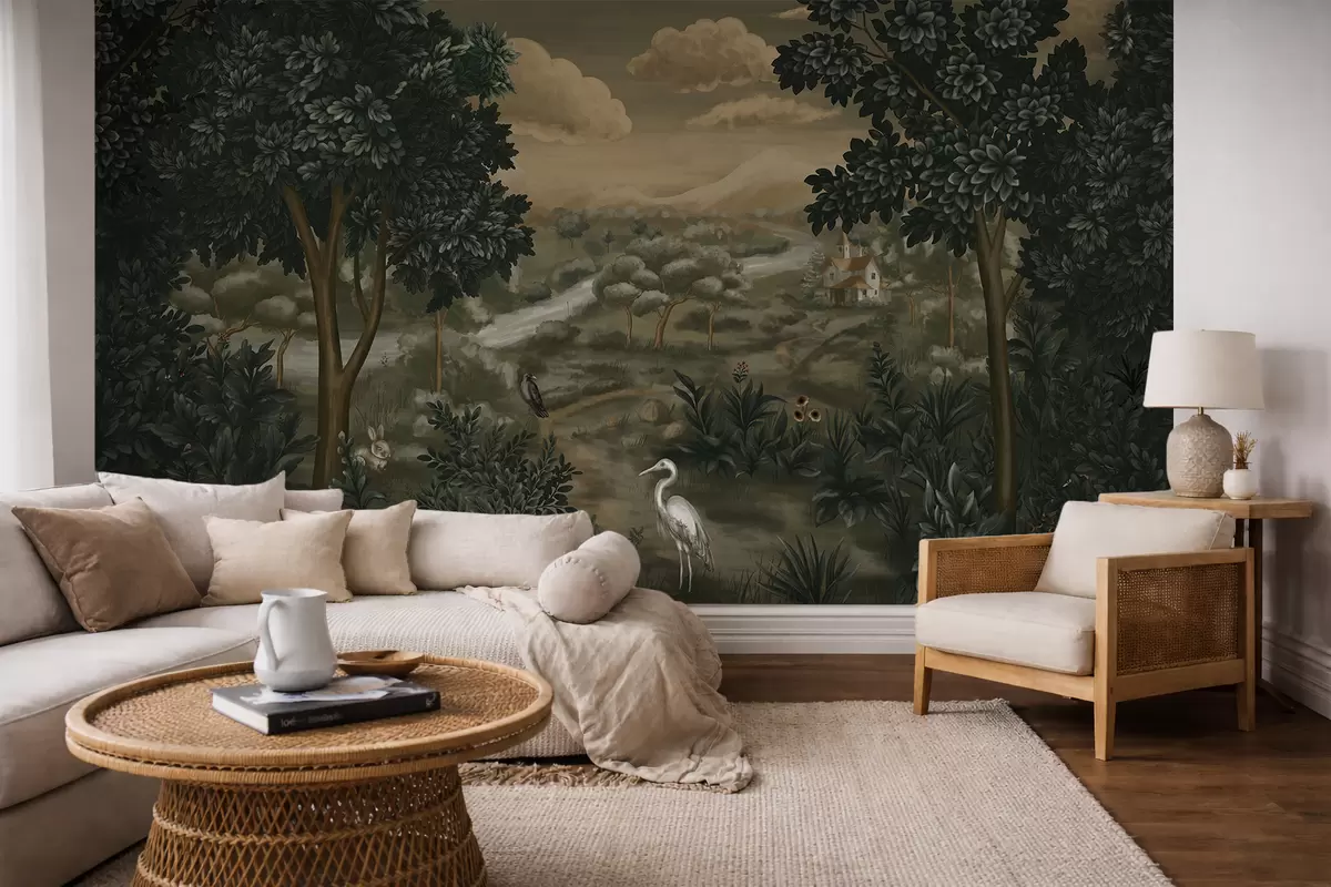 Фототапет Фантастичен пейзаж с река, къща и птици сред дърветата Nr w05090