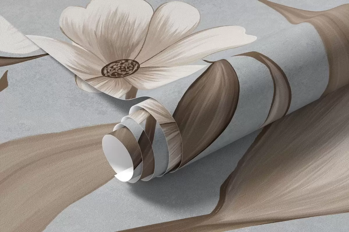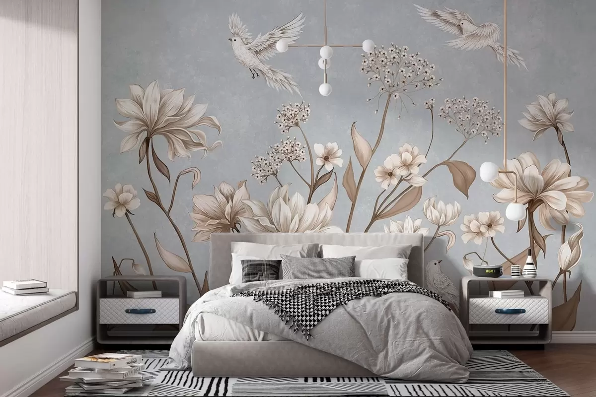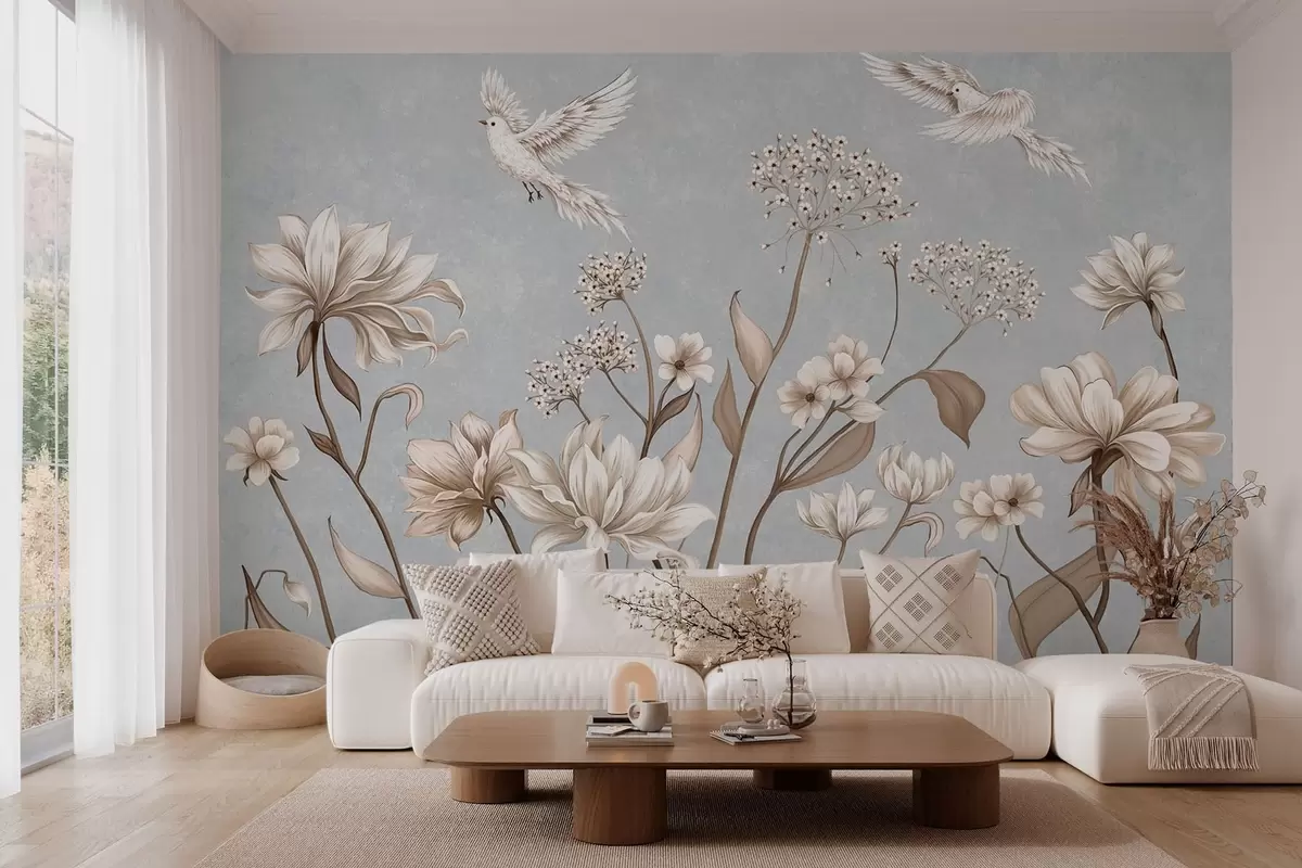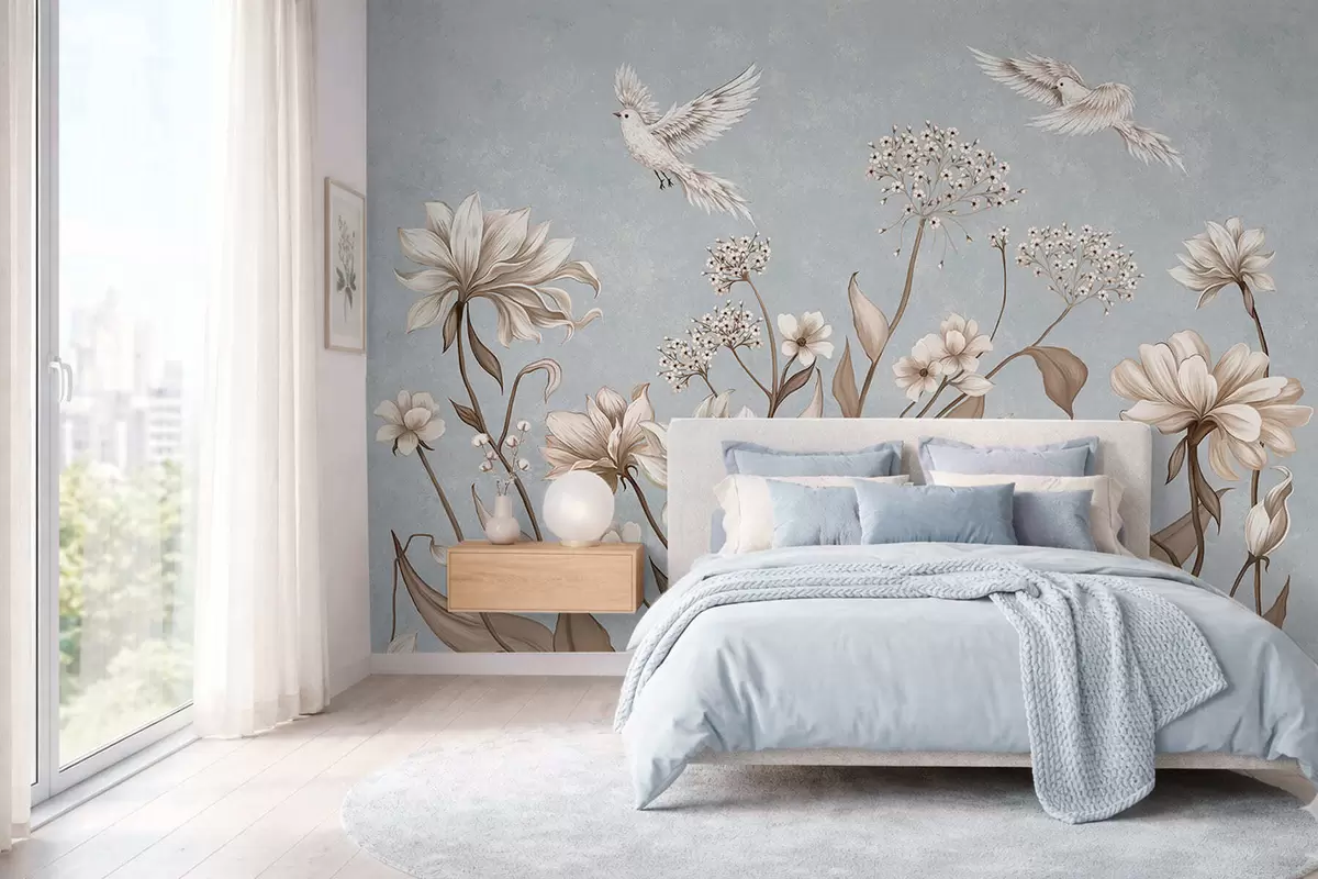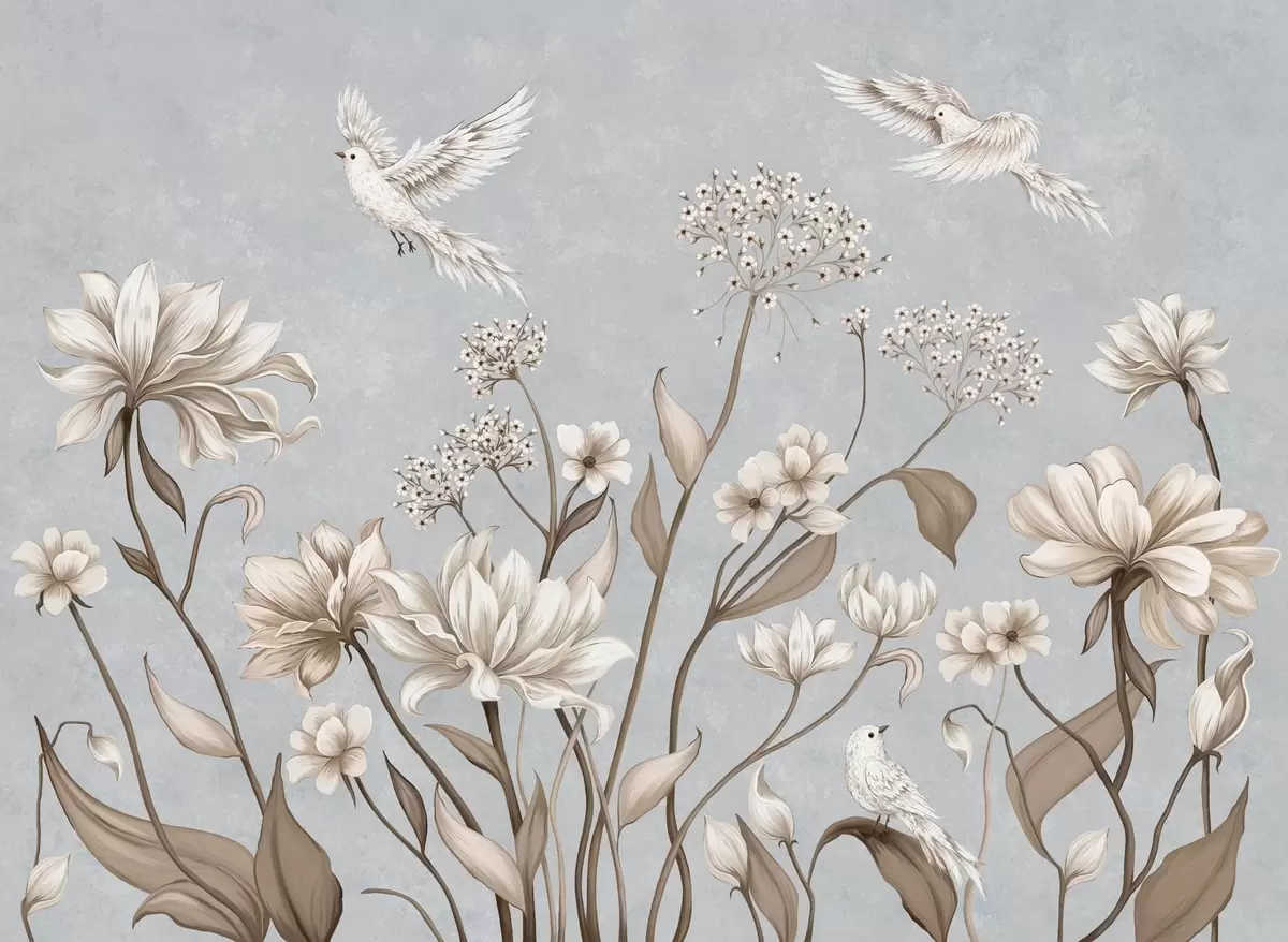 Фототапет Цветя и птици на хладен сиво-син фон Nr w05118v2