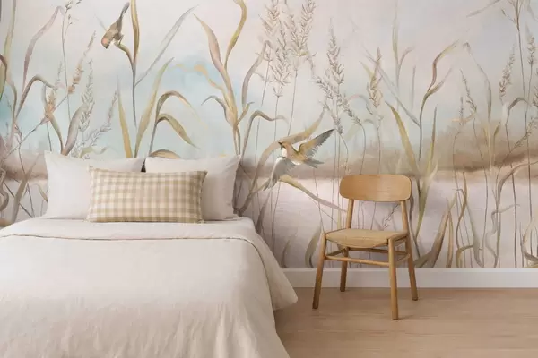 Фототапет Илюстрация на тръстика и птици край водата в меки тонове Nr w05125