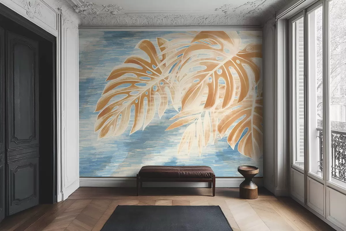 Фототапет Листа в светли пясъчни тонове на син фон Nr w05130v1