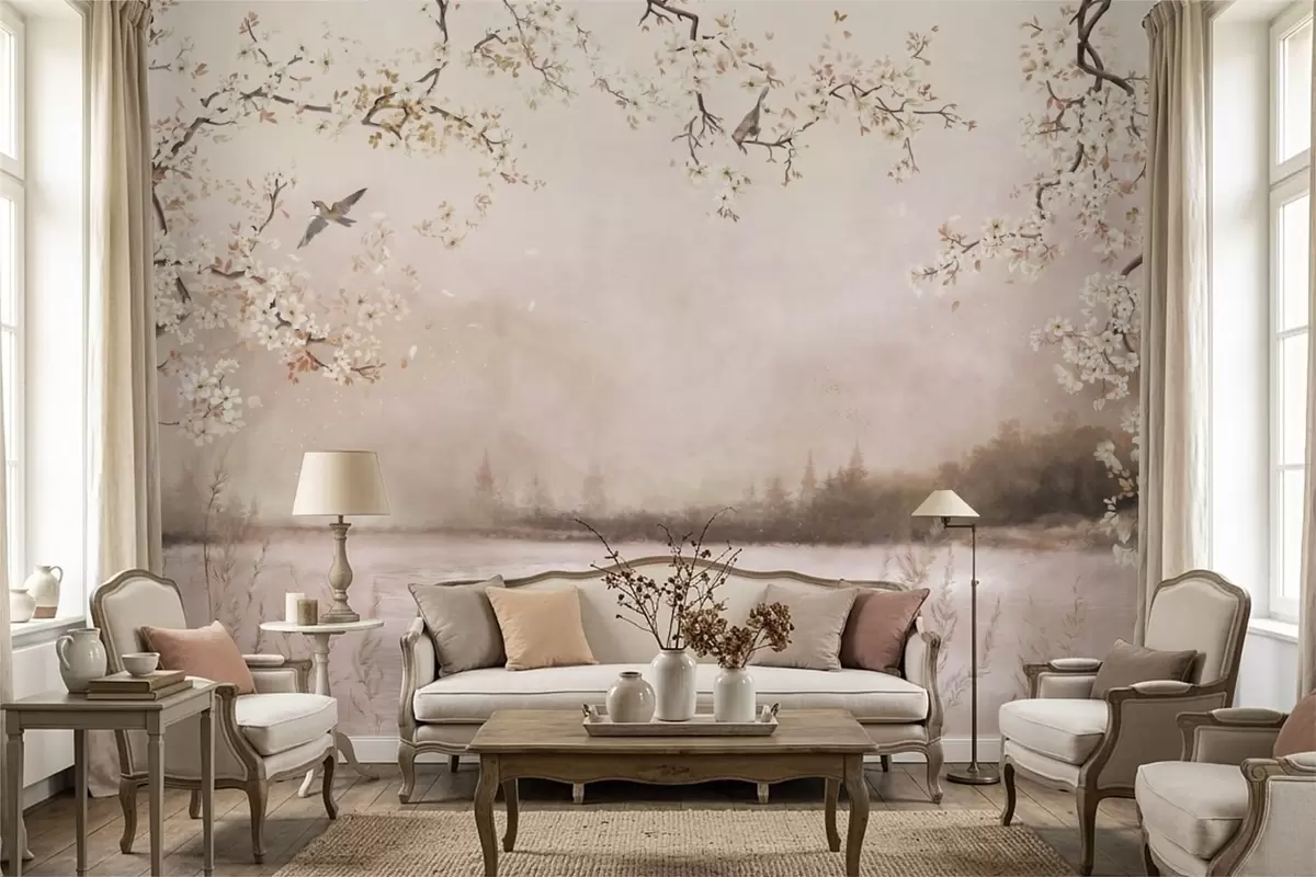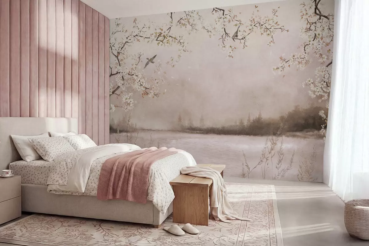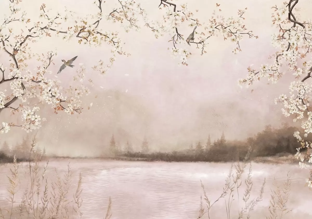 Фототапет Цъфтящи клони над спокойно езеро с птици в мъглата Nr w05155v1