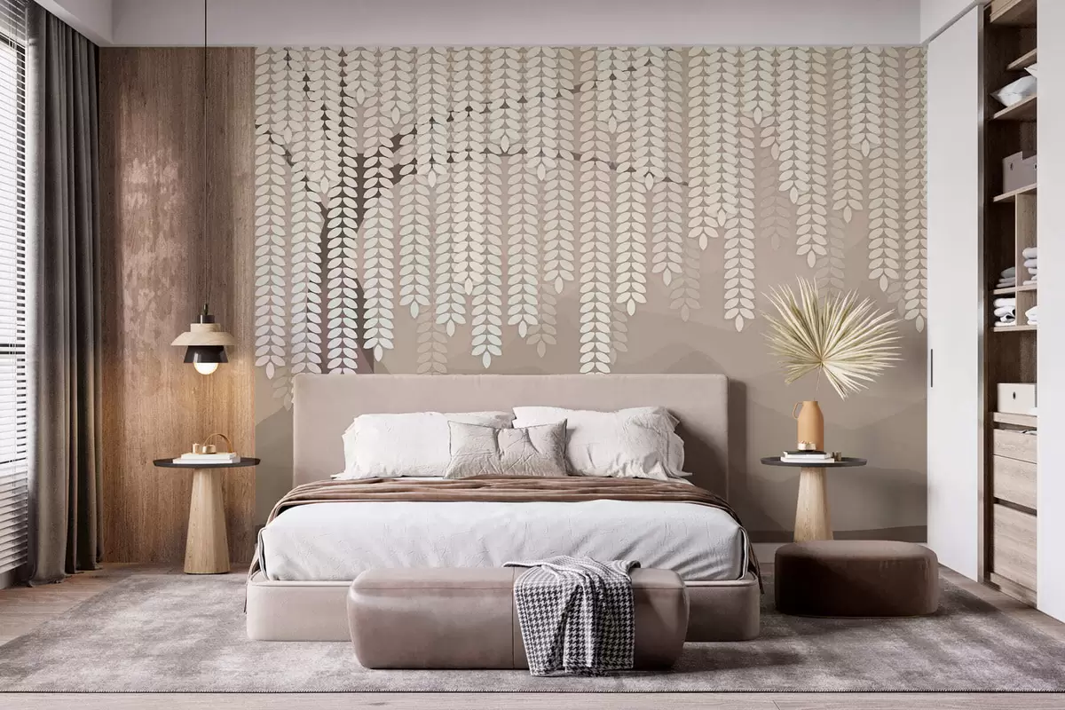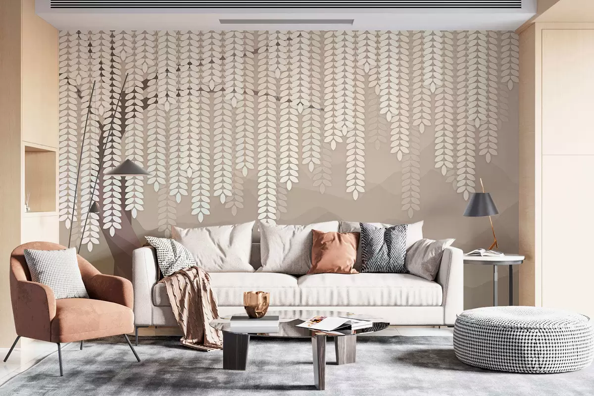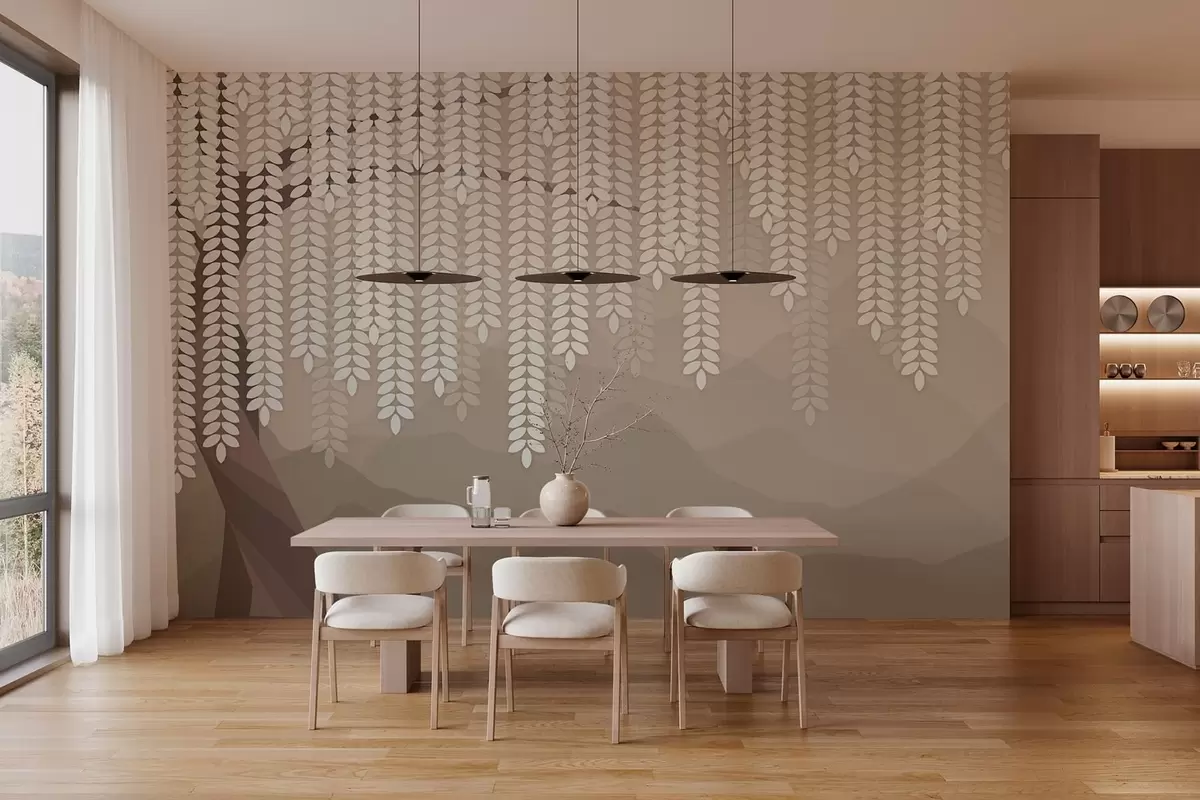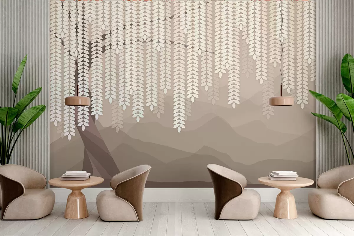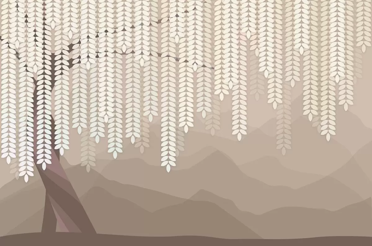 Фототапет стилизирана върба с висящи листа на фона на минималистични планини в нюанси на кафе Nr w05232v2