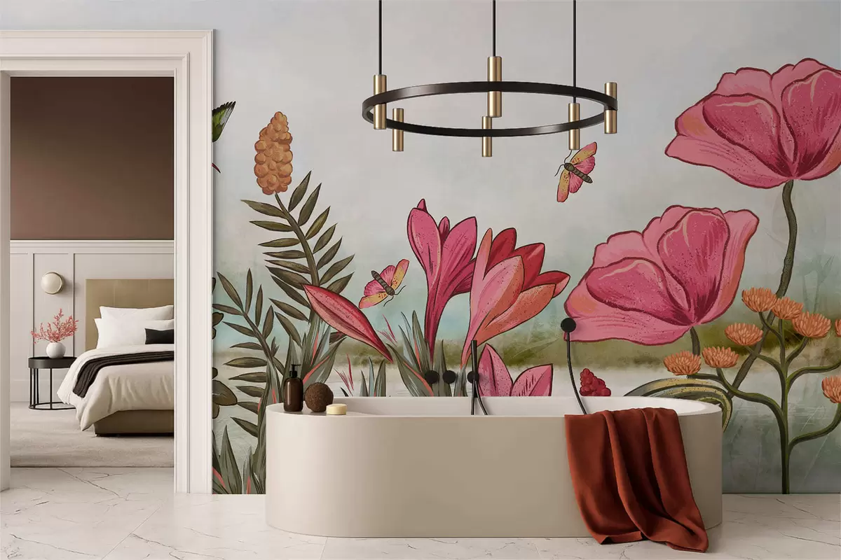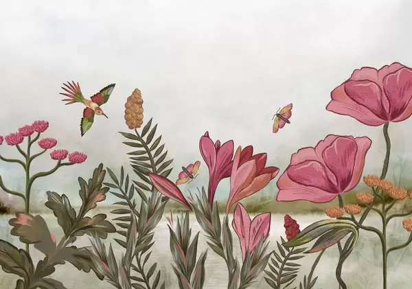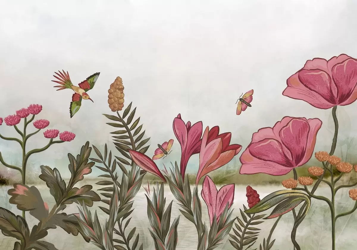 Фототапет Ярки цветя с птици и пеперуди Nr w05321