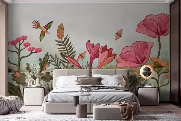 Фототапет Ярки цветя с птици и пеперуди Nr w05321