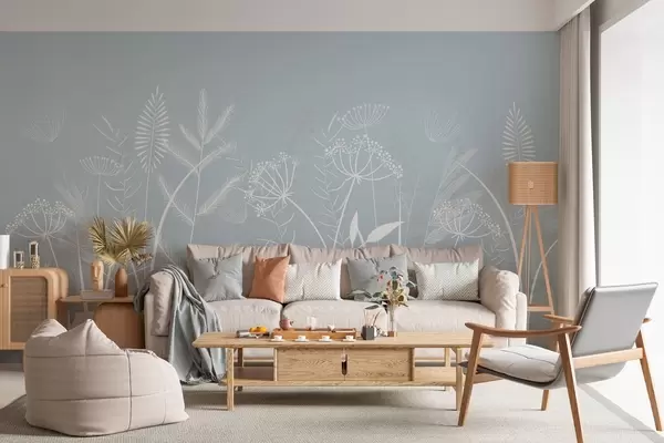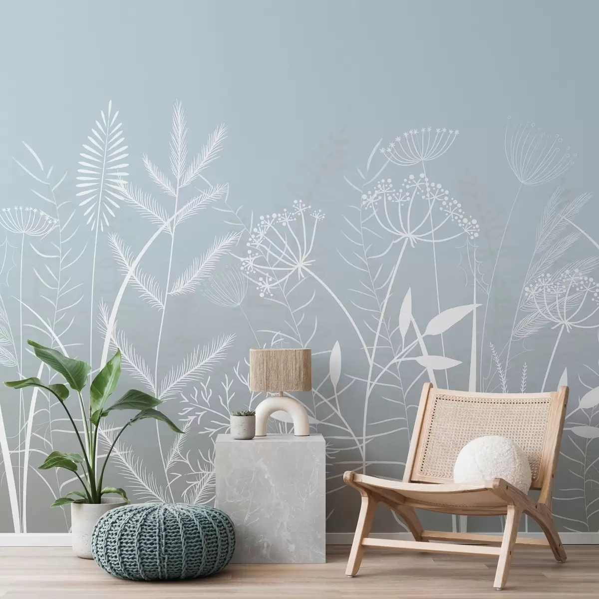 Фототапет фини, ръчно рисувани диви треви и цветя на сиво-син фон Nr w05383