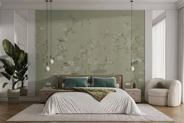 Фототапет Цъфтящи клони с птици на светлозелен фон Nr w05416