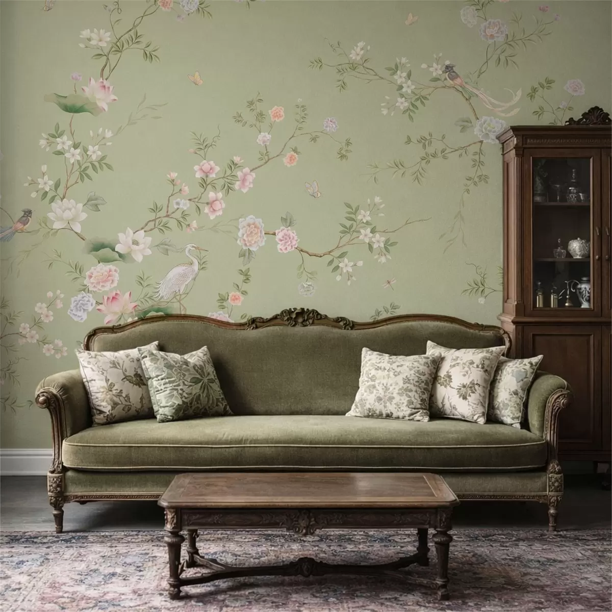 Фототапет Цъфтящи клони с птици на светлозелен фон Nr w05416