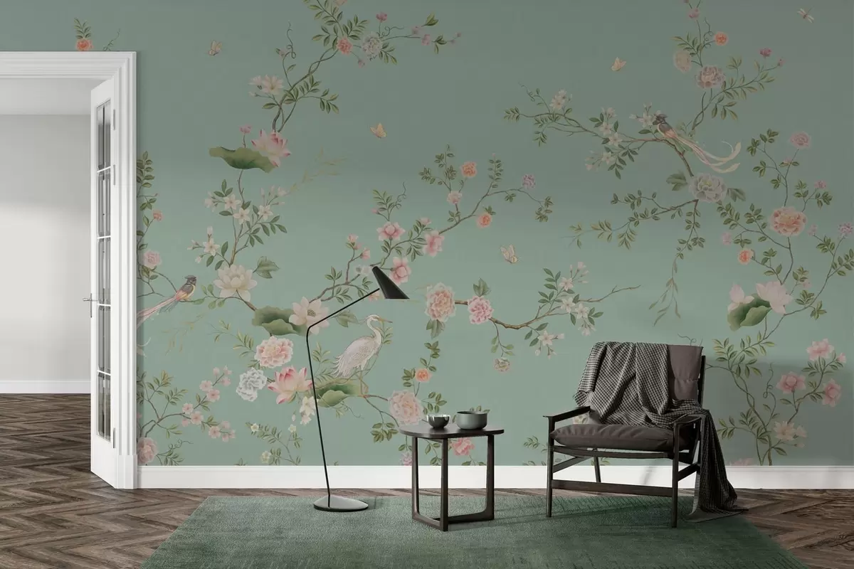 Фототапет Цъфтящи клони с птици на син фон Nr w05416v1