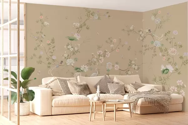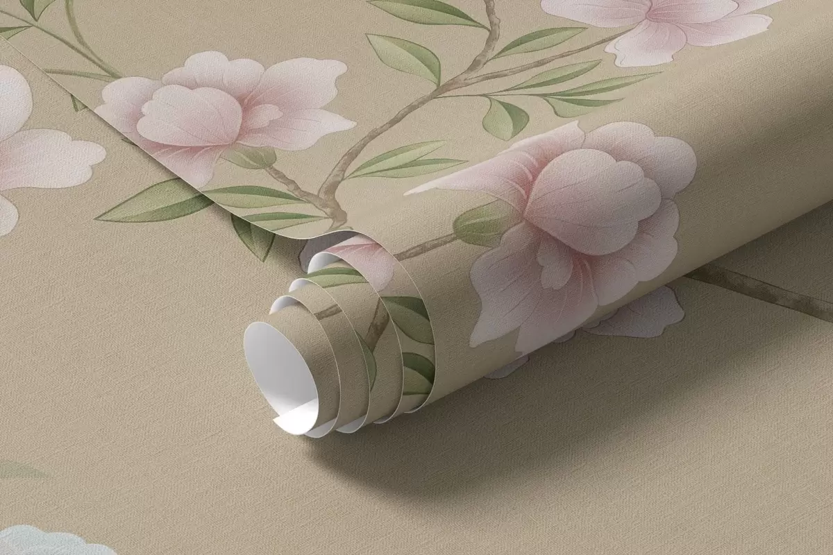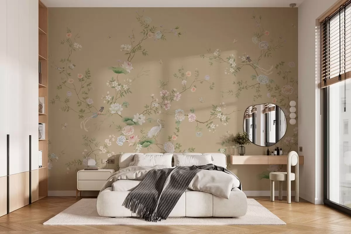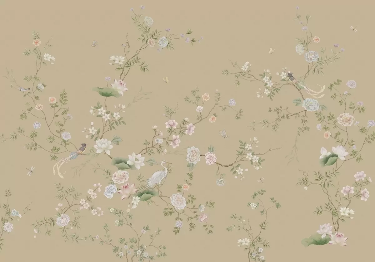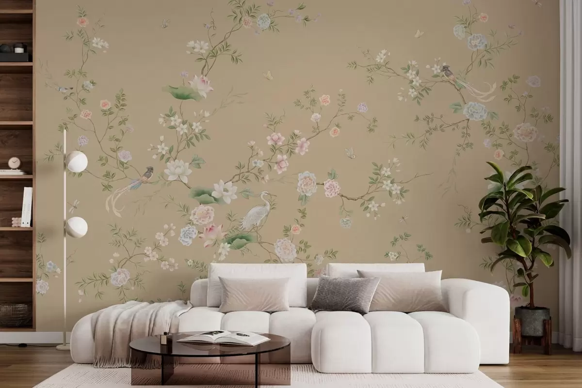 Фототапет Цъфтящи клони с птици на топъл бежов фон Nr w05416v2