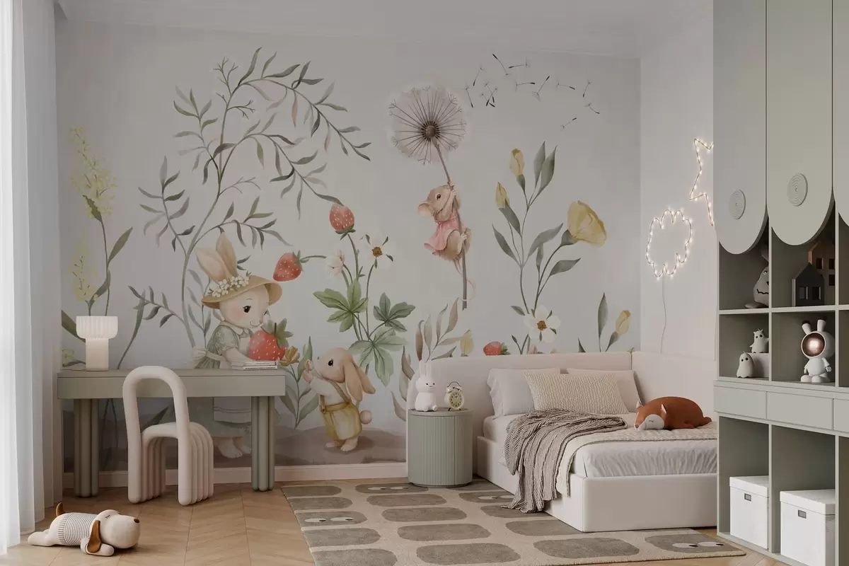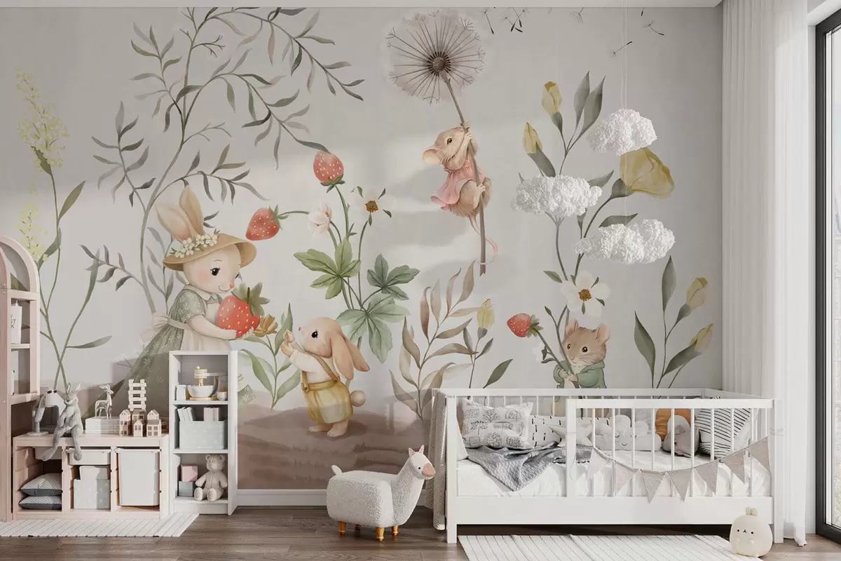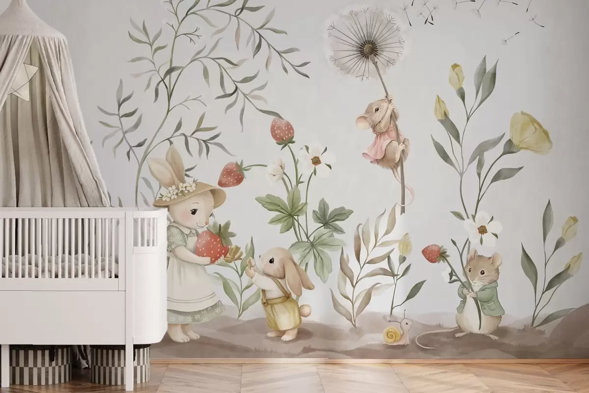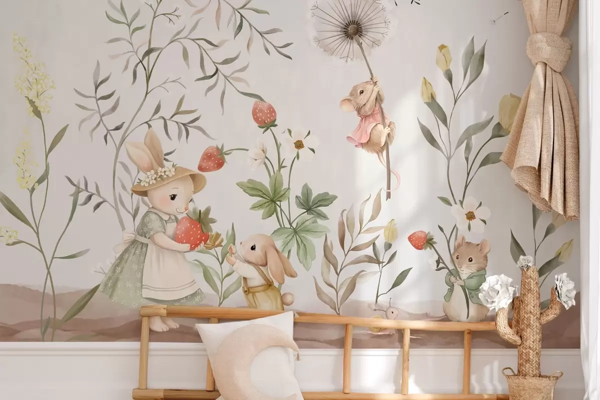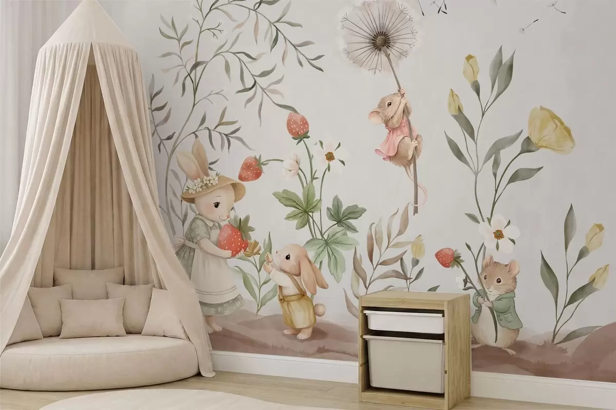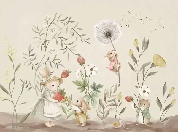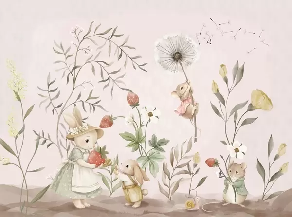 Фототапет Детска илюстрация на зайче и мишка сред растения и цветя Nr w05422