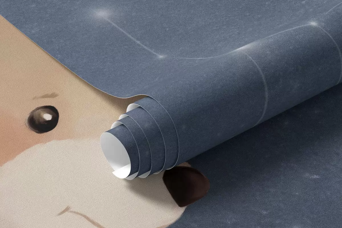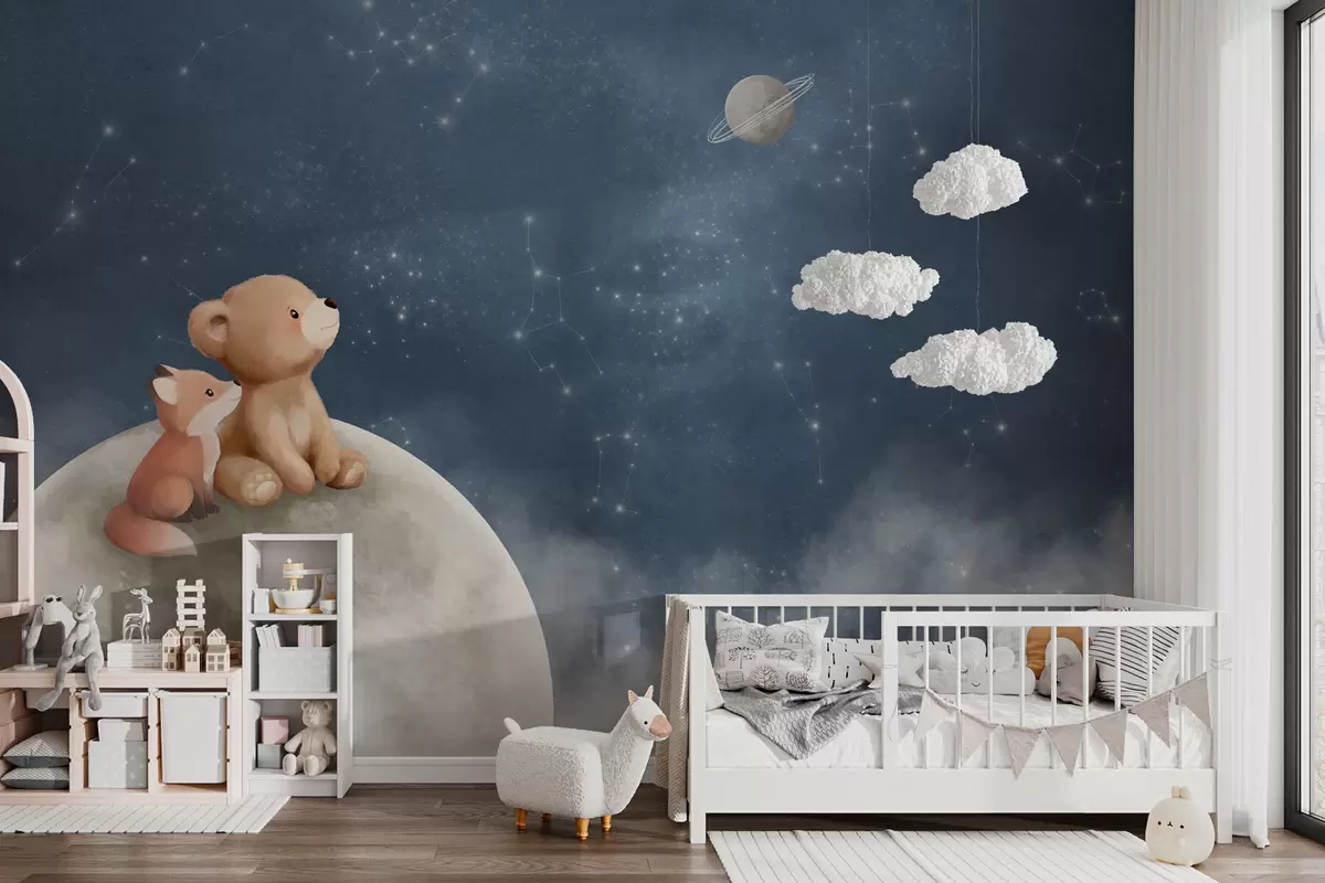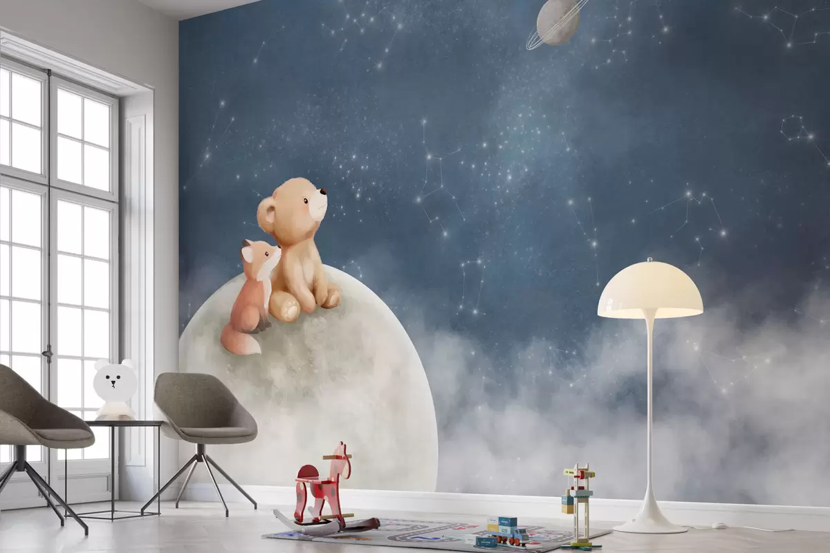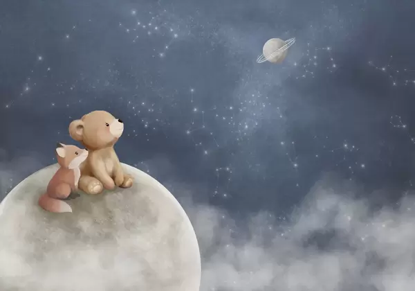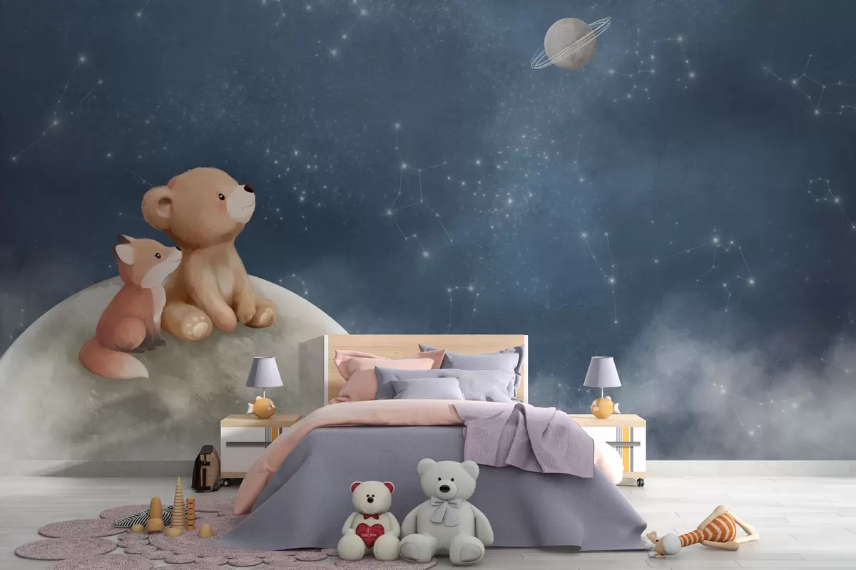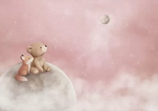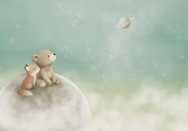 Фототапет Пастелна илюстрация с мечка и лисица под нощното небе Nr w05431