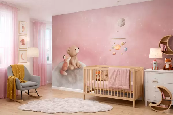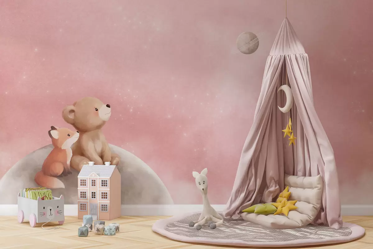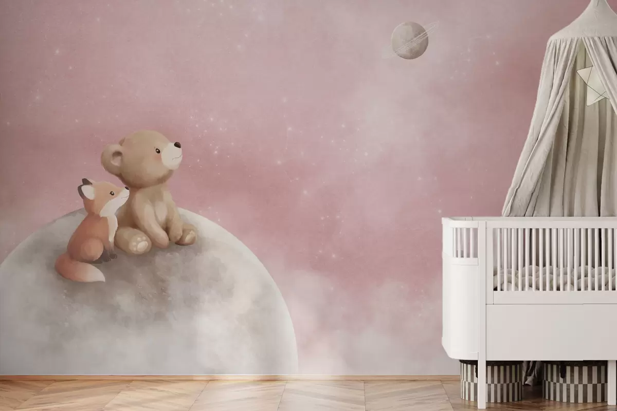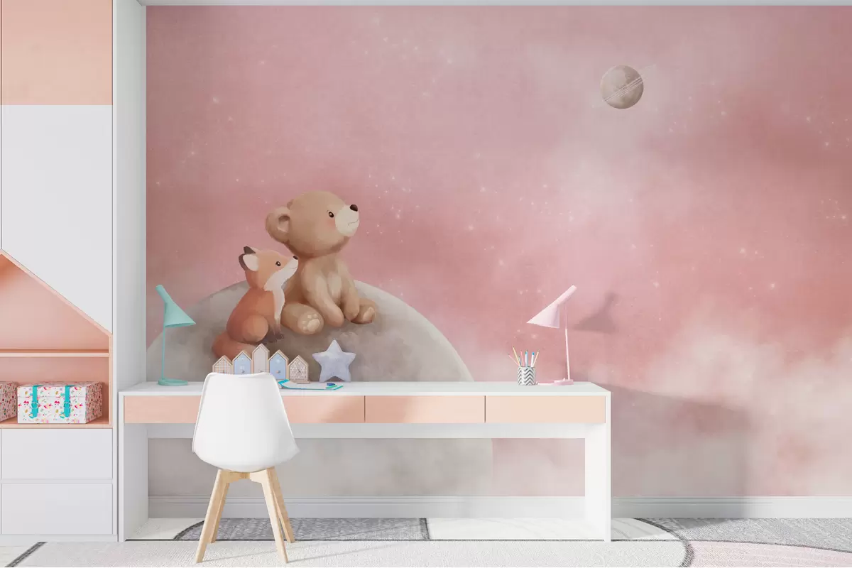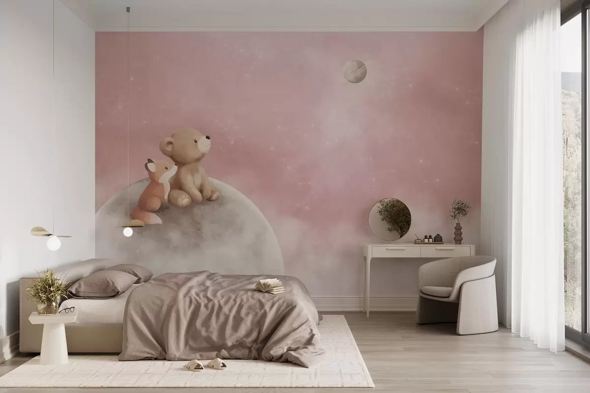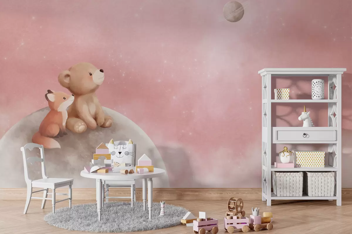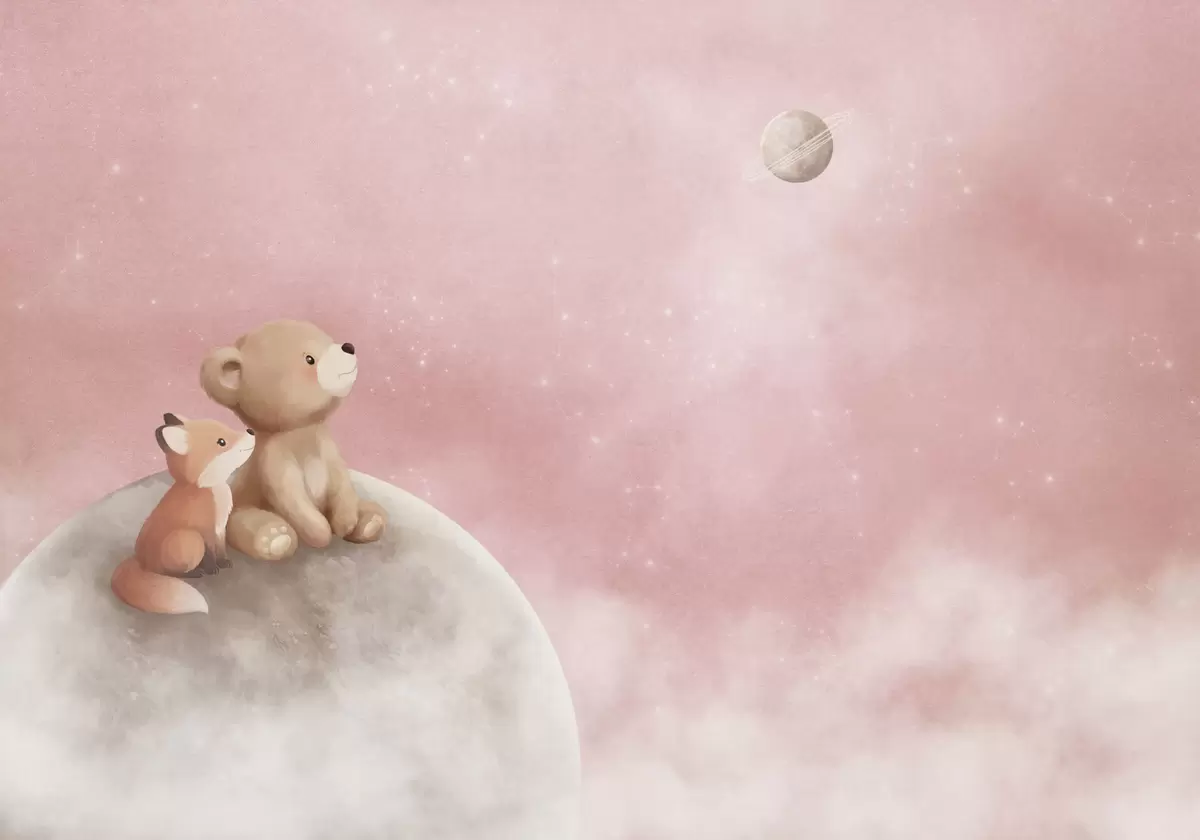 Фототапет Пастелна илюстрация на мечка и лисица на фона на розово лунно небе Nr w05431v2