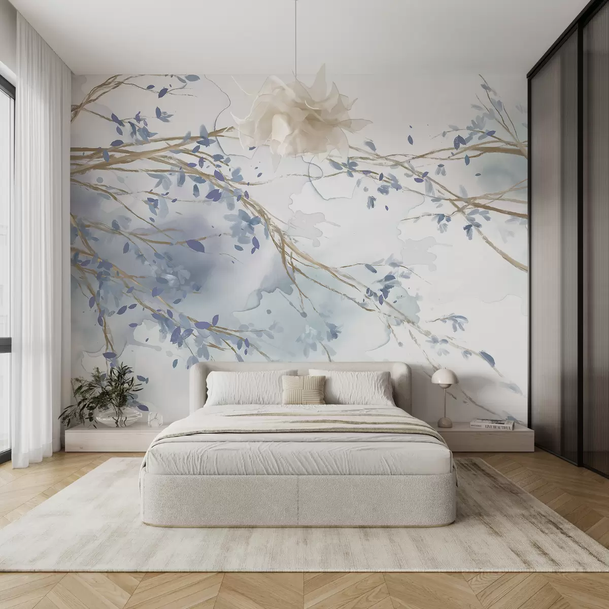 Фототапет Деликатни сини и бели флорални клони с мек, замъглен акварелен фон Nr w07919