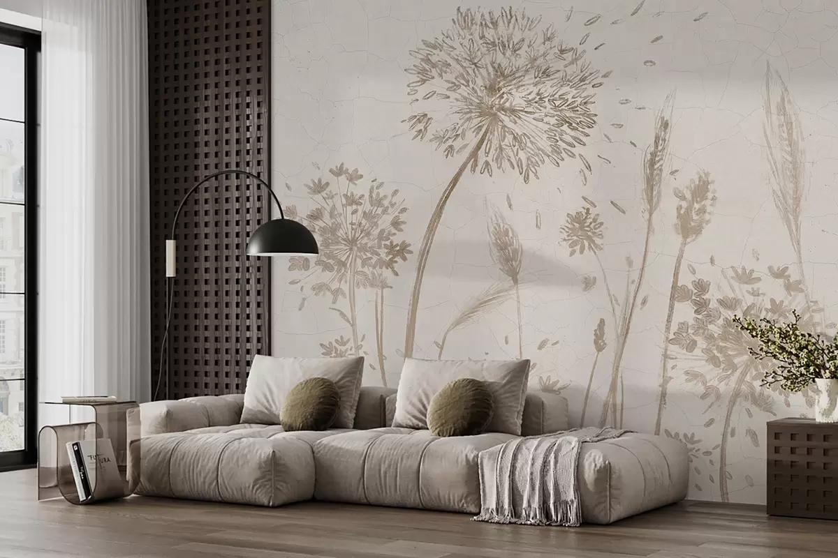 Фототапет Поле от глухарчета и други диви цветя на мек мъглив фон Nr w07921
