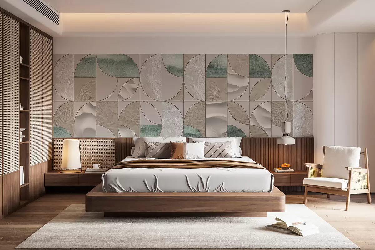 Фототапет Геометричен модел от зелени, бежови и бели текстури, подредени в повтарящ се абстрактен дизайн Nr w07928