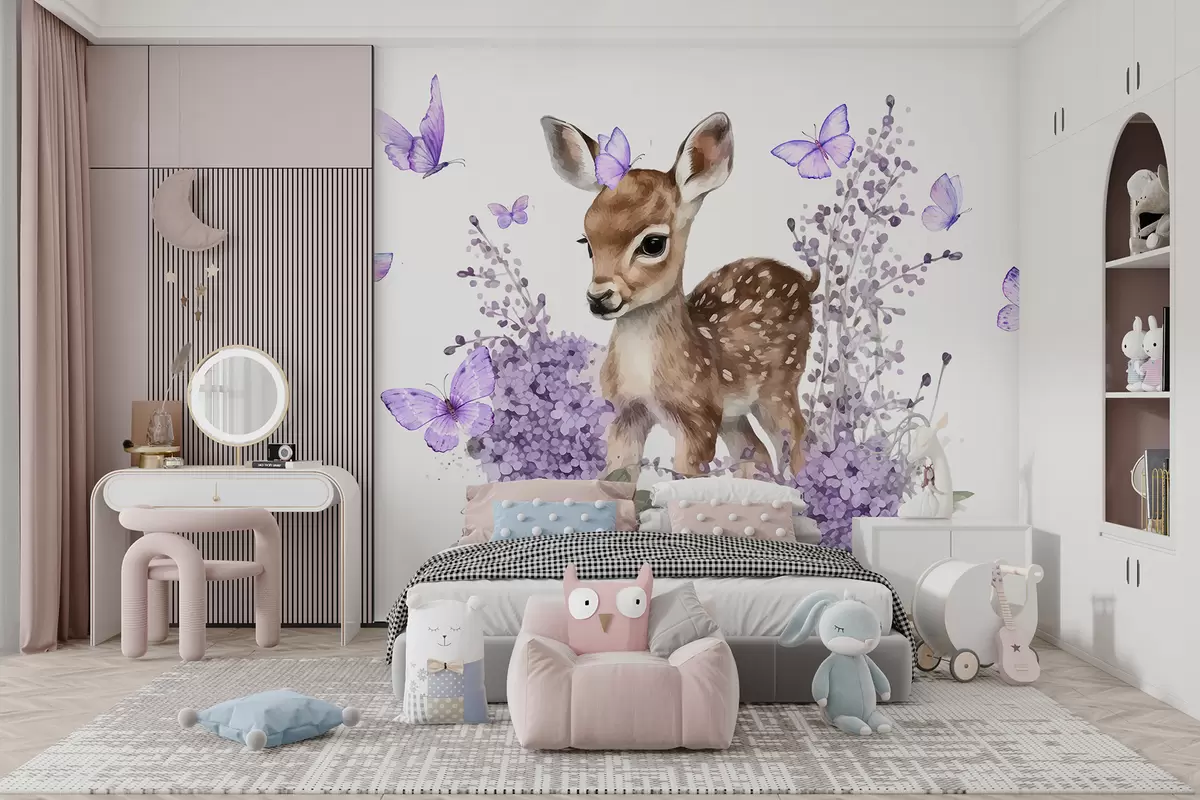 Фототапет Млад елен с големи очи и петниста козина, заобиколен от лилави цветя и пеперуди Nr w07931