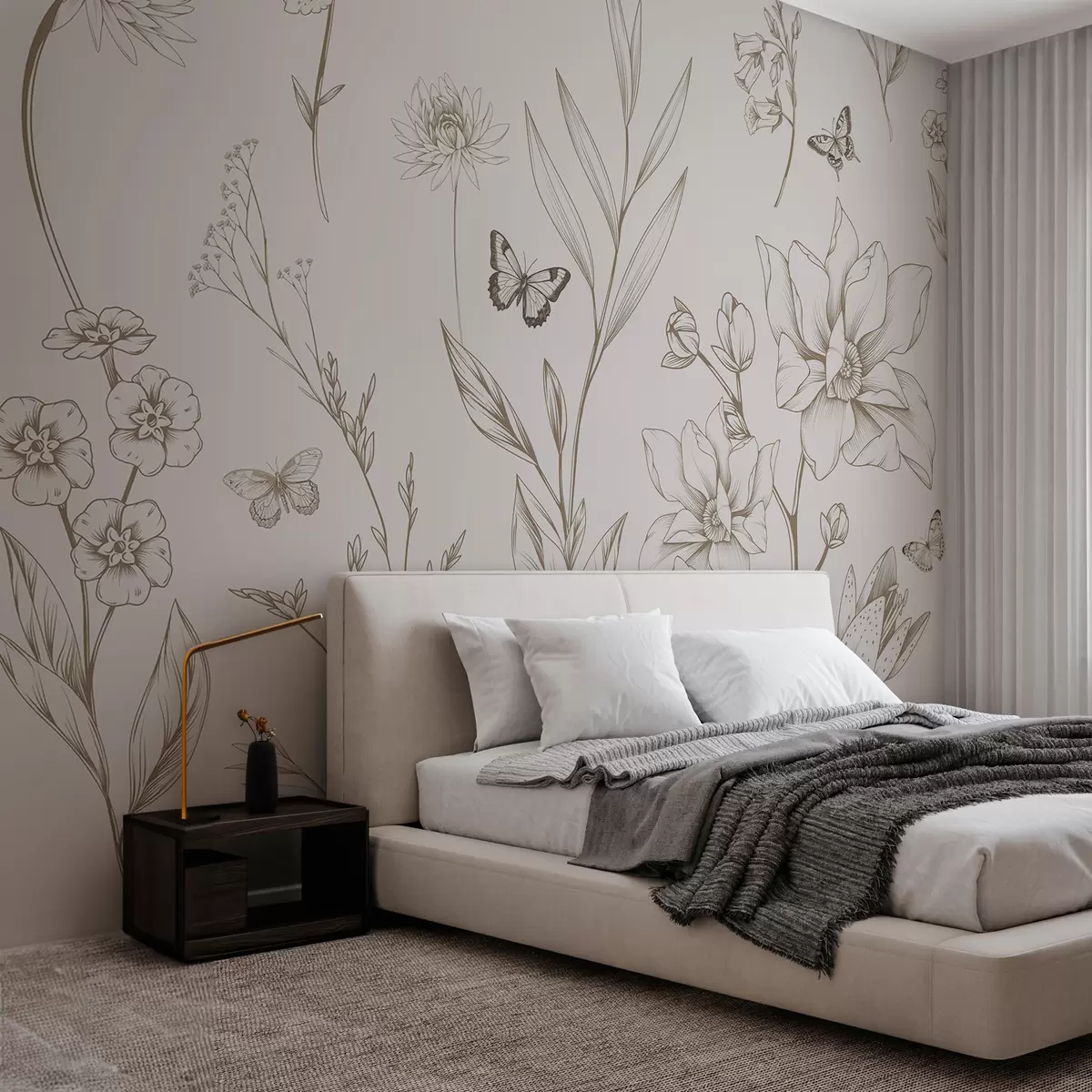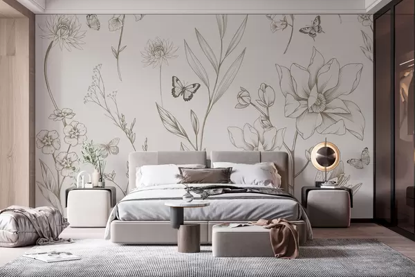 Фототапет Бохо монохромни цветя и пеперуди в бежов цвят Nr w08088v1
