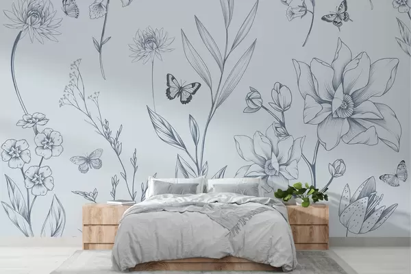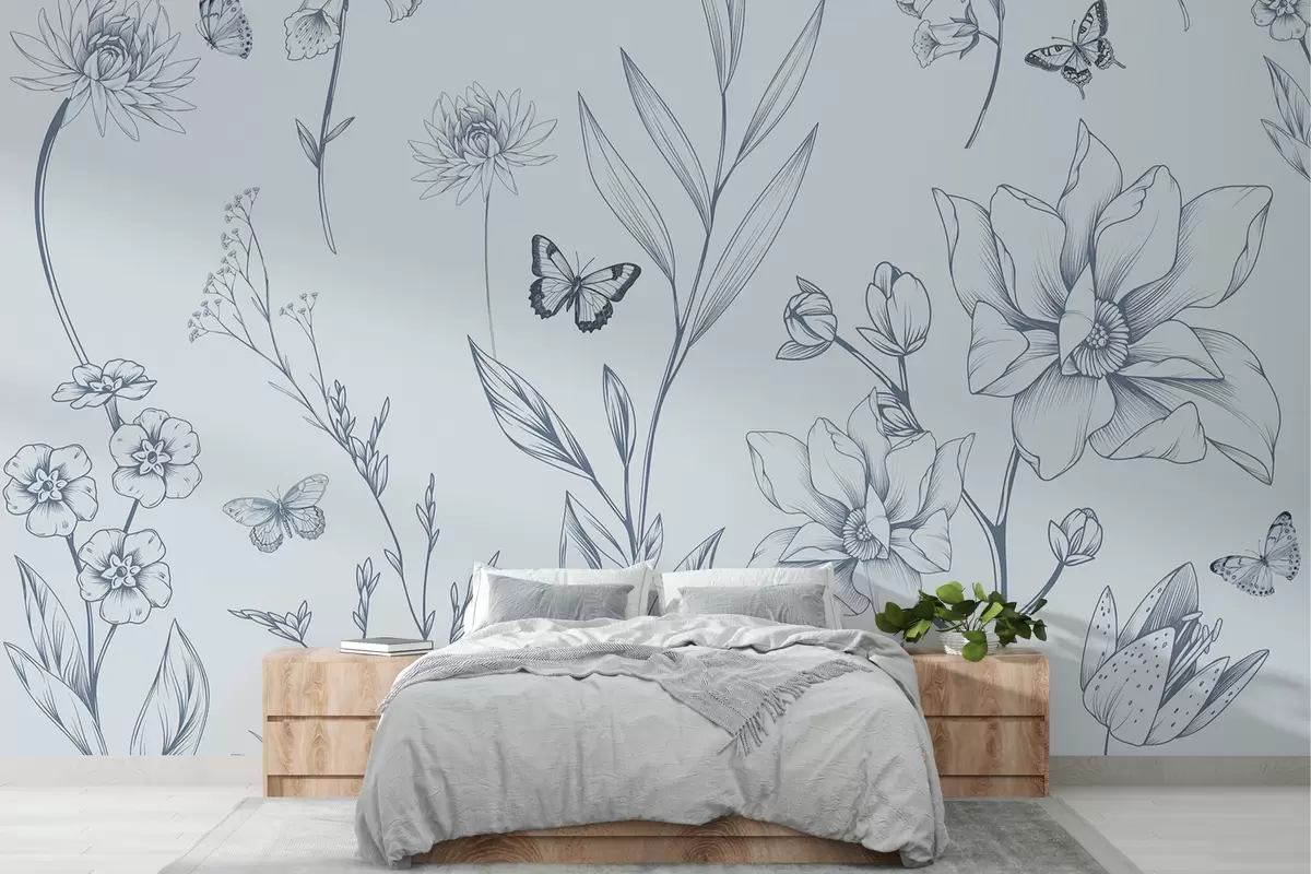 Фототапет Бохо монохромни цветя и пеперуди в синьо w08088v2