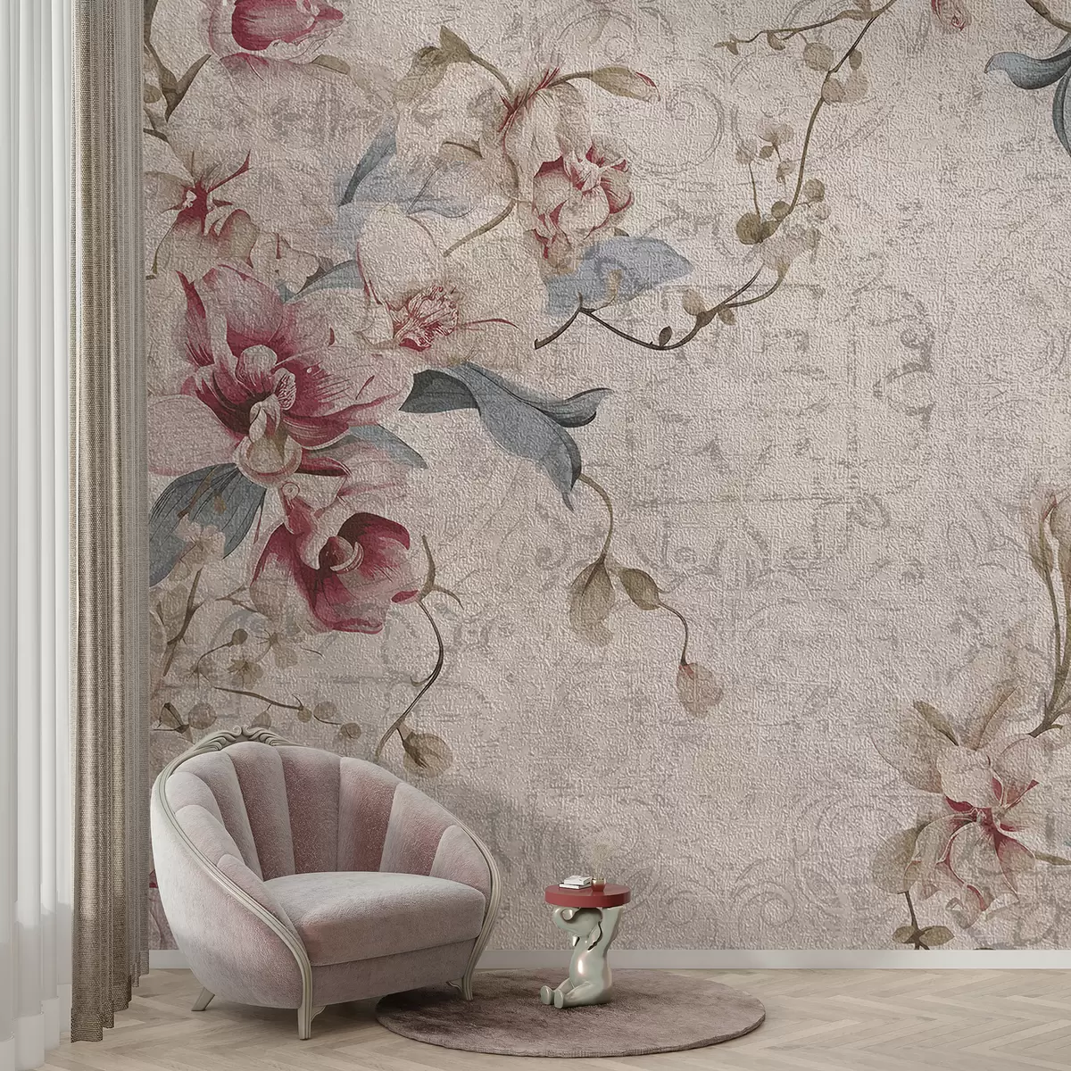 Фототапет Винтидж флорален модел с нежни розови и бели цветя, листа на светло бежов фон Nr w08149