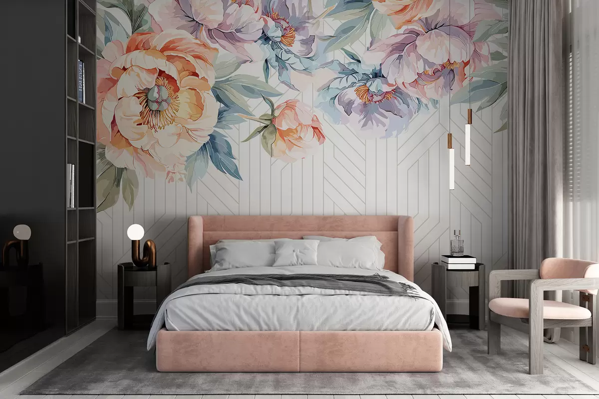 Фототапет Живи прасковени и розови абстрактни божури със зелени листа на бял и сив фон Nr w08183