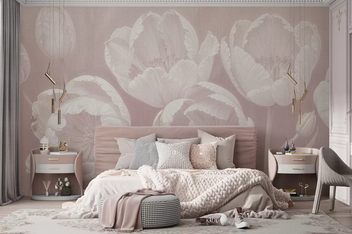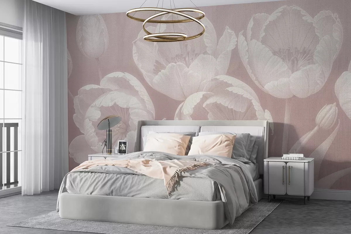 Фототапет Рисунка на бели лалета с мека текстура на платно на бежов размазан фон минимализъм монохромен печат Nr w08193