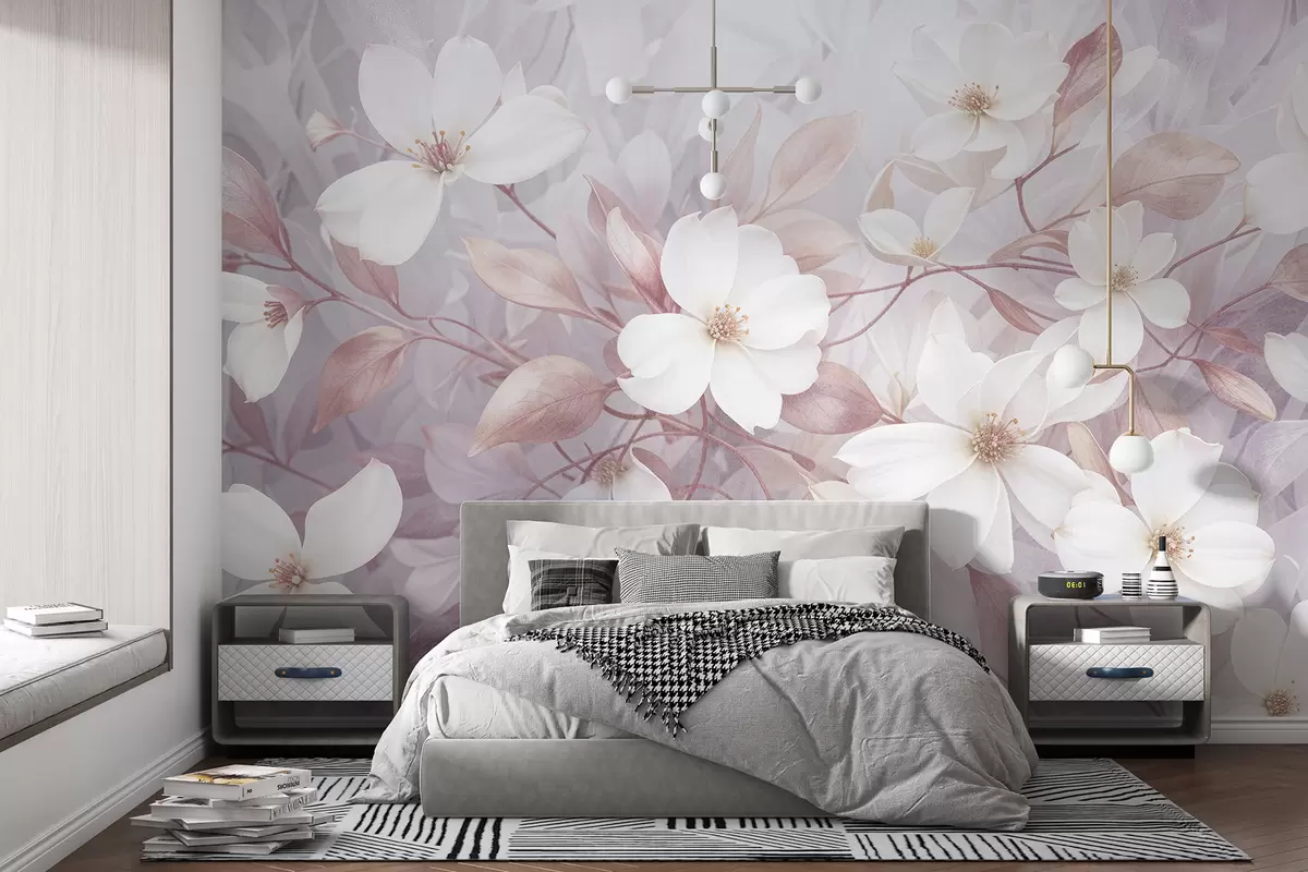 Фототапет Деликатни розови и бели цветя на магнолия, цъфтящи на меки, замъглени клони на блед фон Nr w08196