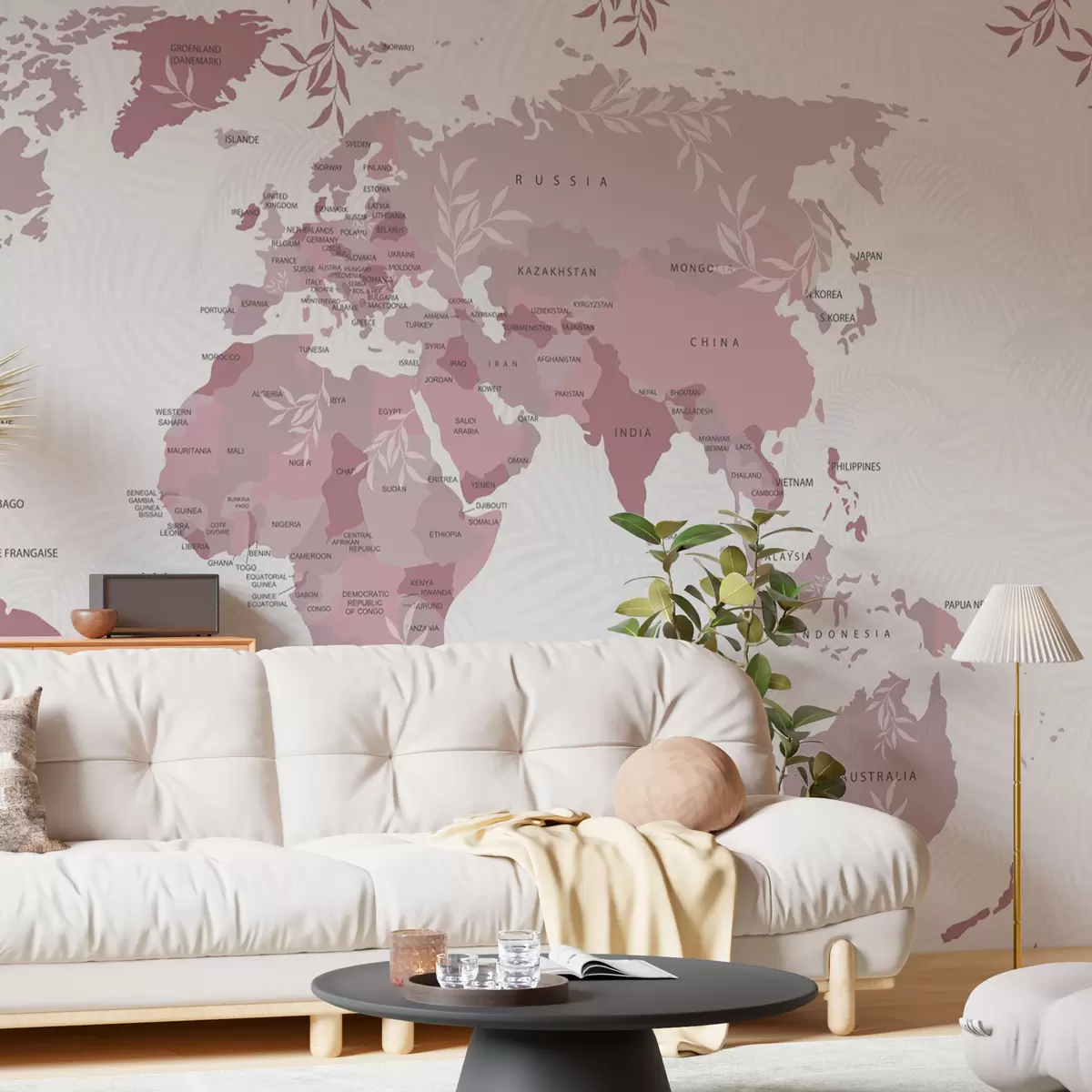 Фототапет Стилна карта на света с розови листа и растения Nr w08211v3