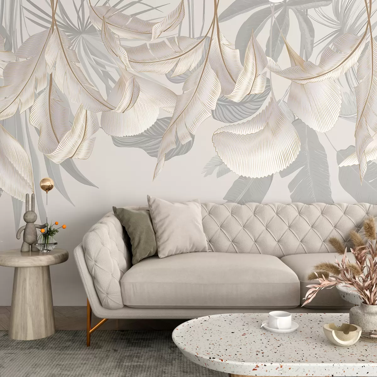 Фототапет Деликатни бели и сиви флорални тропически листа, създаващи мек, ефирен фон w08217