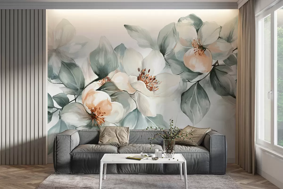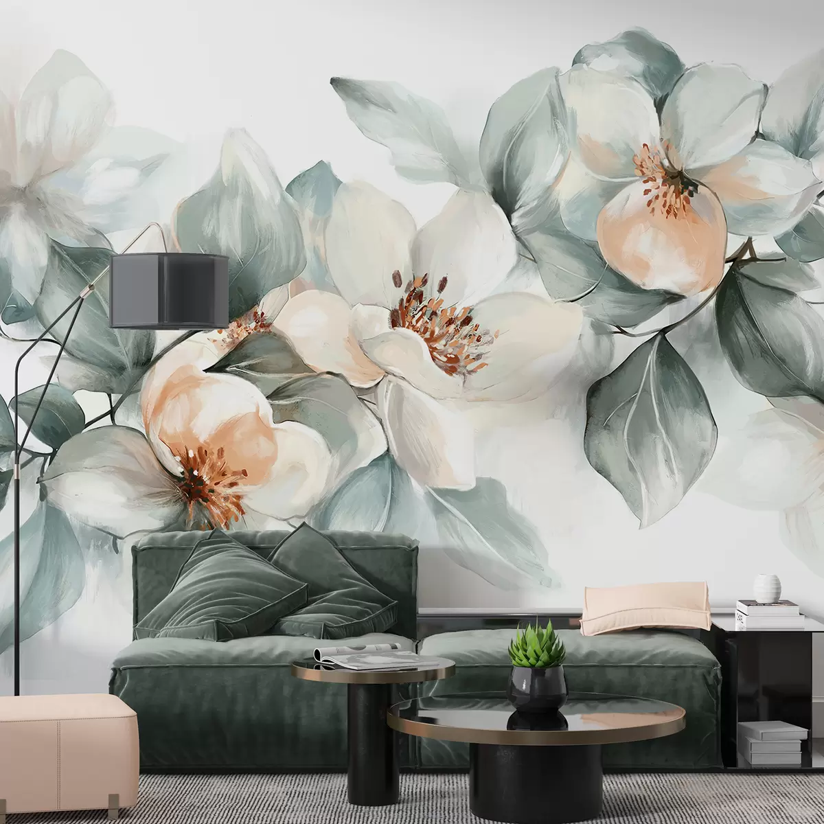 Фототапет Деликатни бели и розови цветя на магнолия с меки зелени листа на светъл фон Nr w08220