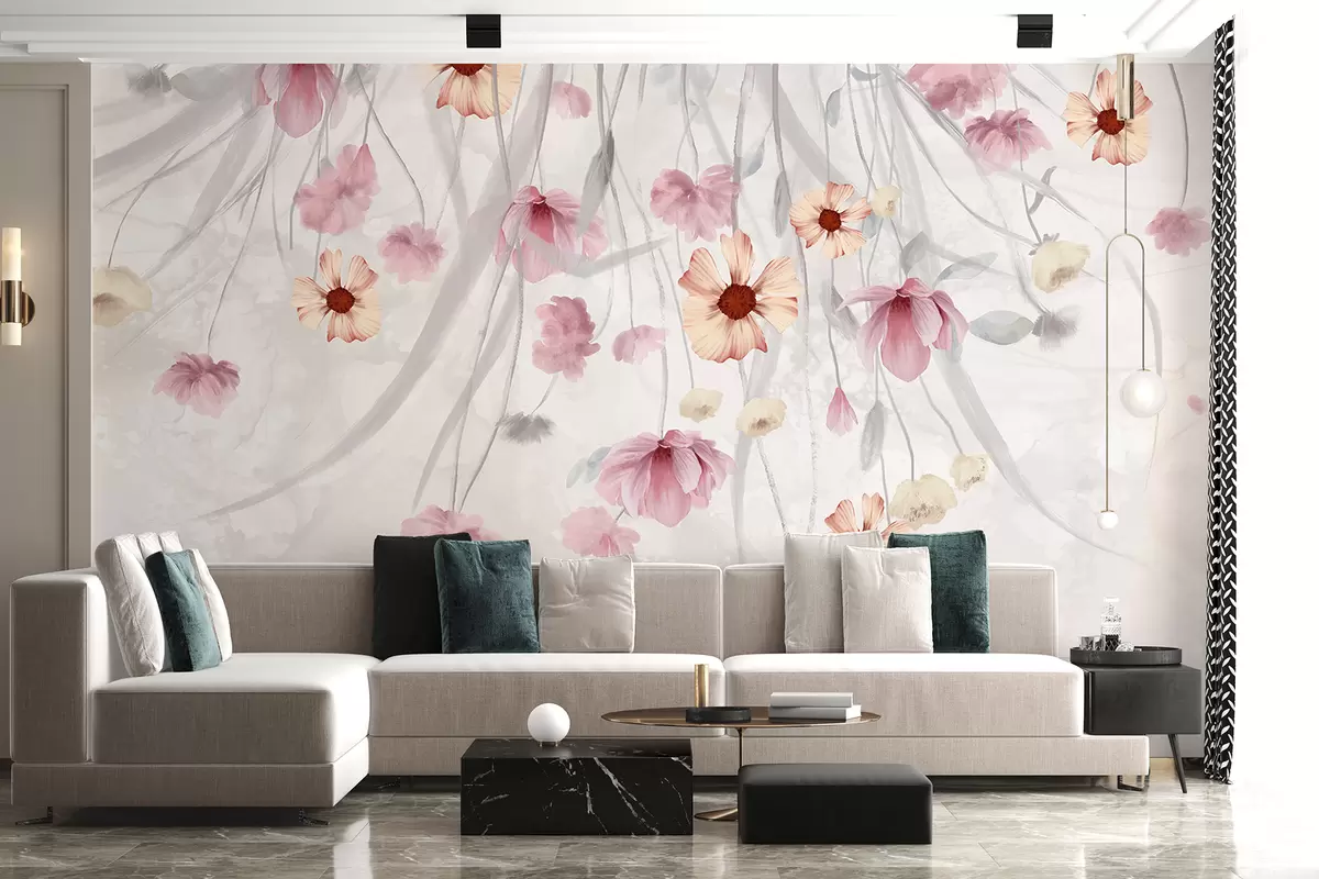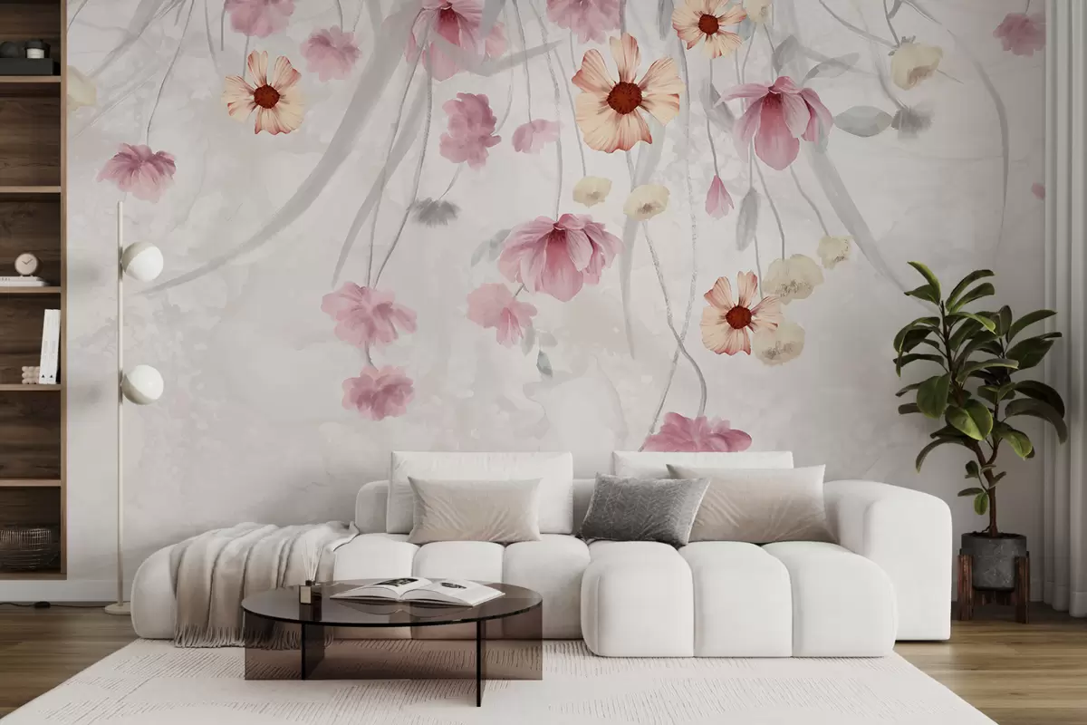 Фототапет Деликатни пастелни розови и жълти цветя с жълти центрове, които се спускат по мек, размазан фон Nr w08261v1