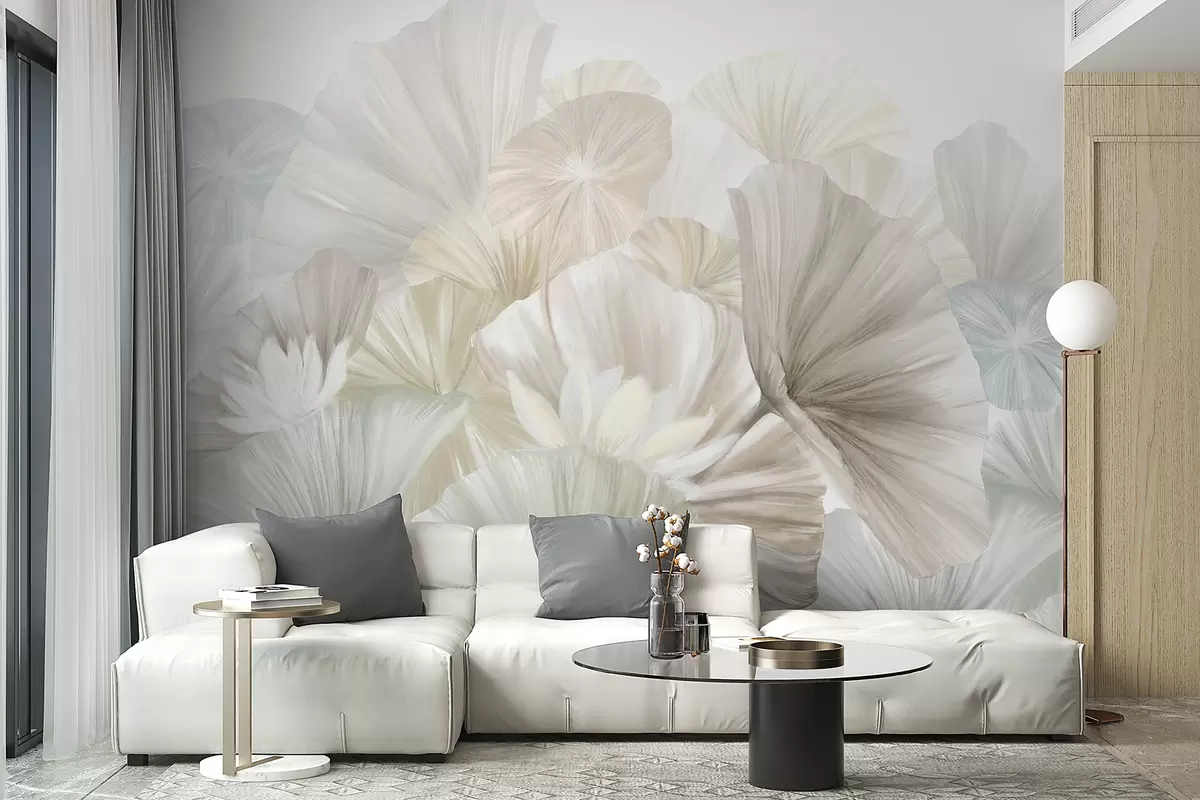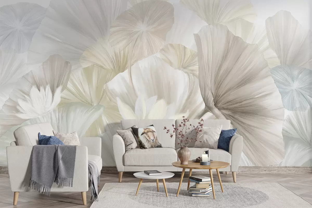 Фототапет Деликатни зелени лотосови листа с бели цветя с меки, пенести венчелистчета, подредени в естествена художествена композиция Nr w08265