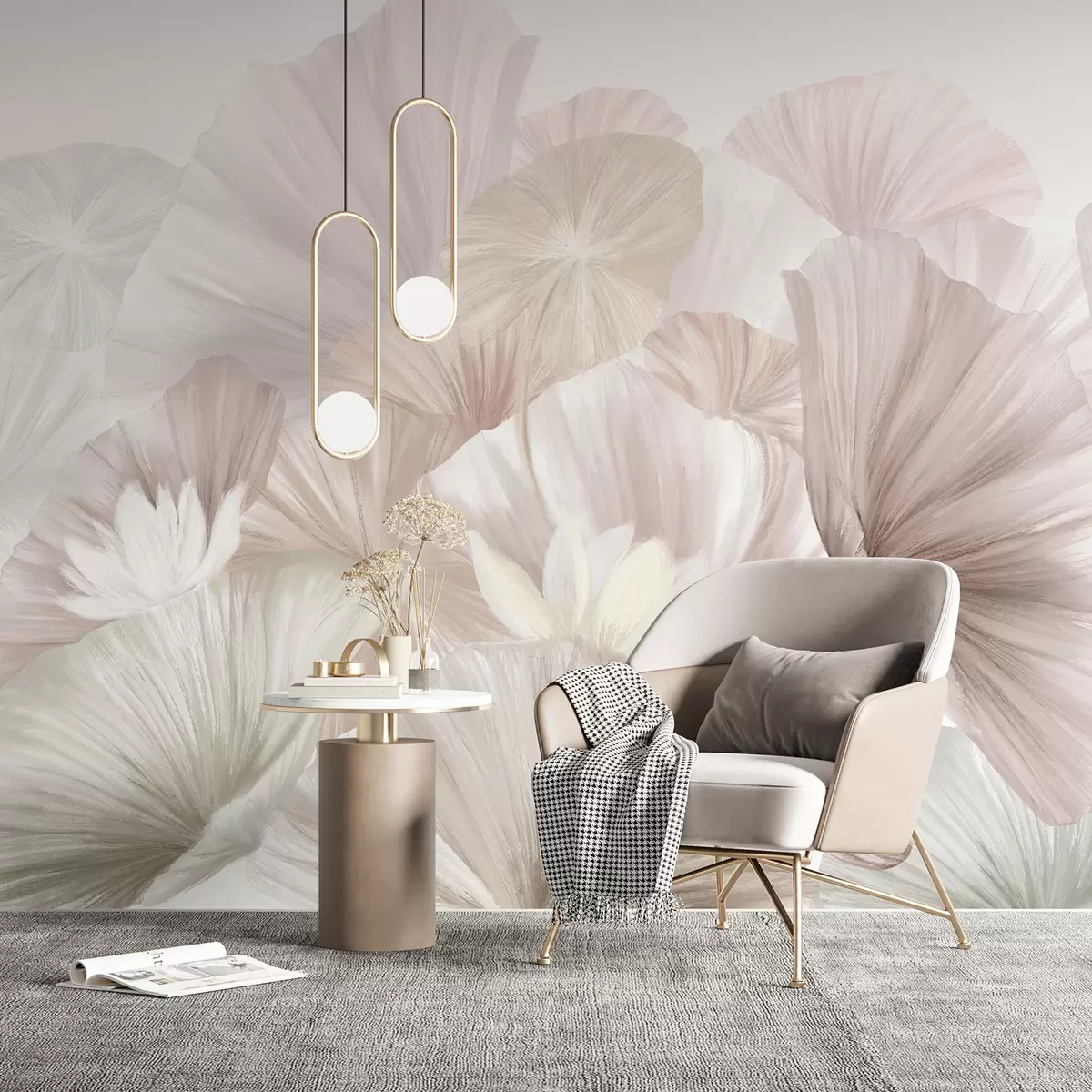 Фототапет Деликатни розови лотосови листа с бели цветя с меки, пенести венчелистчета, подредени в естествена художествена композиция Nr w08265v1