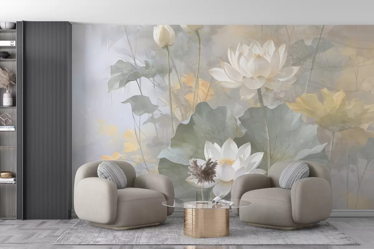 Фототапет Бели лотосови цветя с листа в езеро с мек, размазан жълт и зелен фон Nr w08275