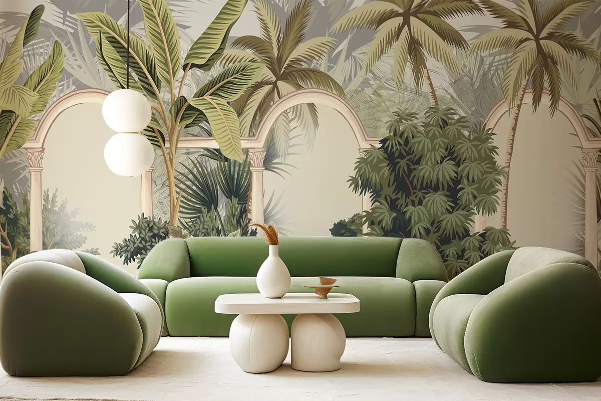 Фототапет Арки с тропически пейзаж, пищни палми и друга зеленина на светъл фон Nr w08306