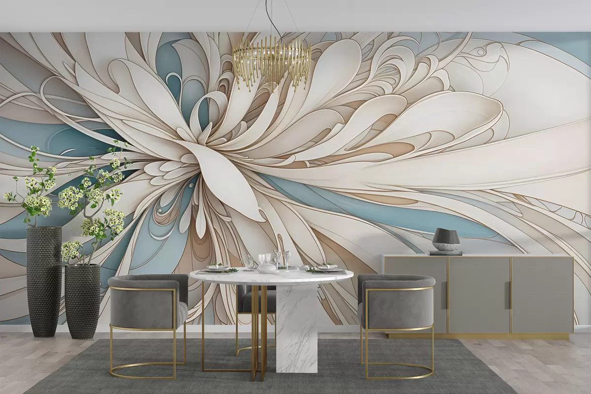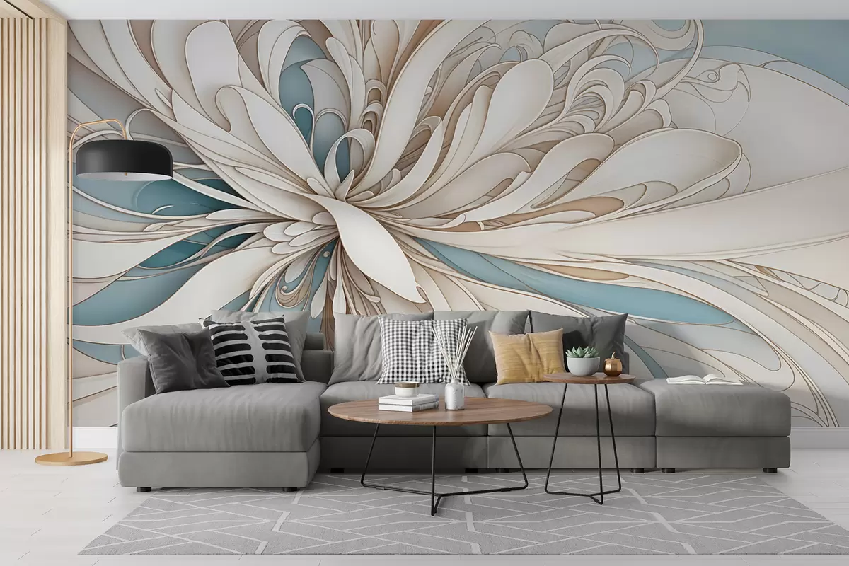 Фототапет Абстрактен флорален десен с въртящи се органични форми в нюанси на бежово, тен и синьо на светъл фон Nr w08311