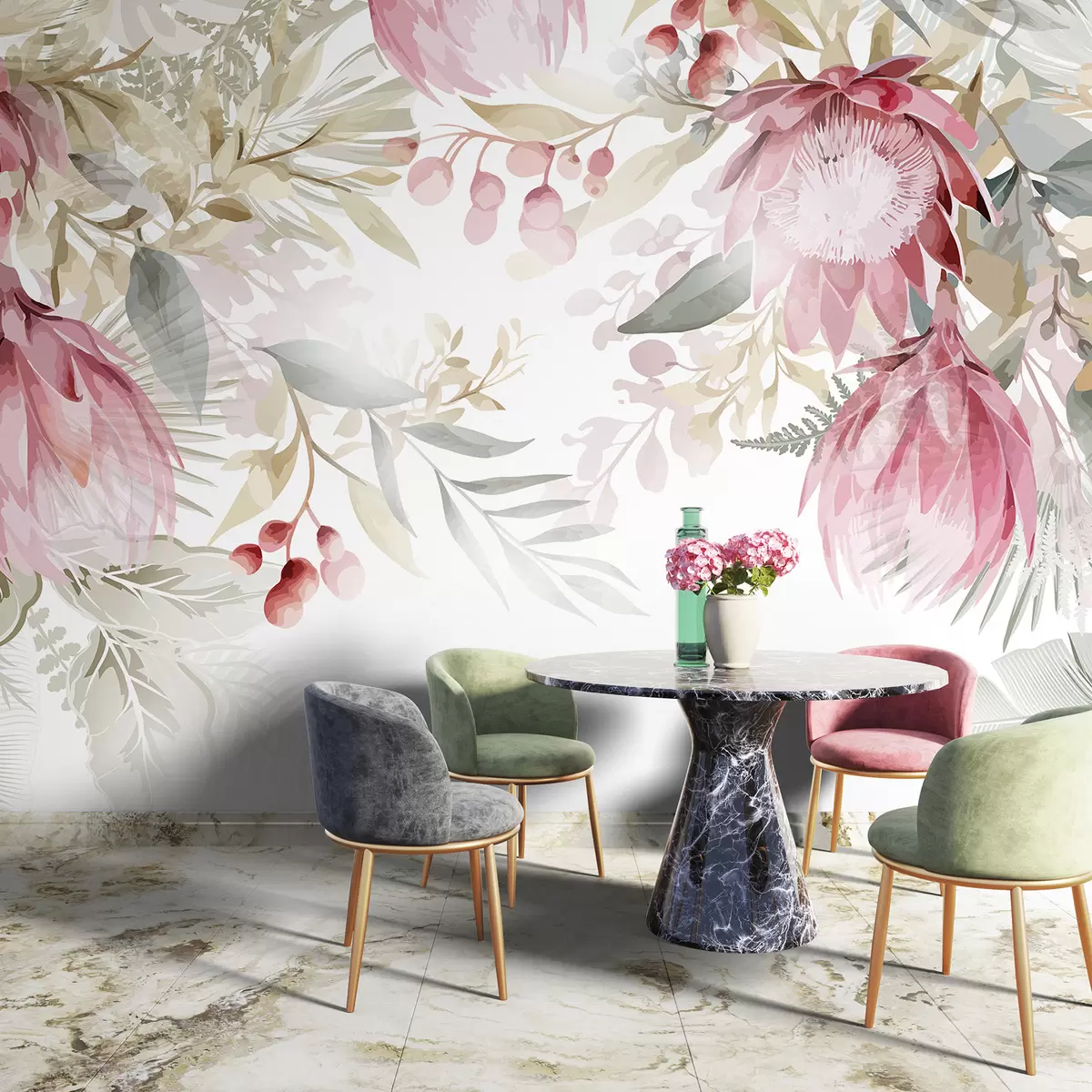 Фототапет Големи розови и бели прозрачни протеи с буйни зелени листа на светъл фон w08315