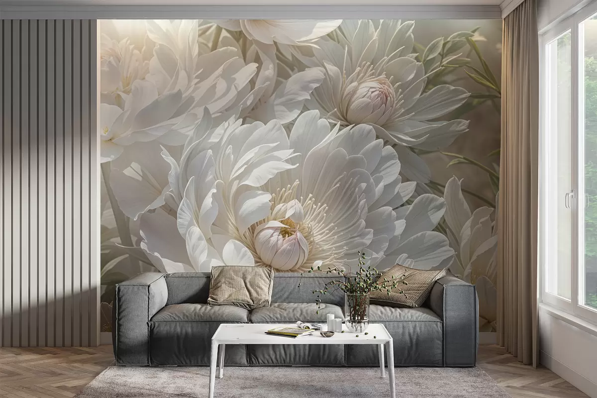 Фототапет Близък план на големи, деликатни бели цветове на божур с меки, пухкави венчелистчета и бледожълти центрове Nr w08325