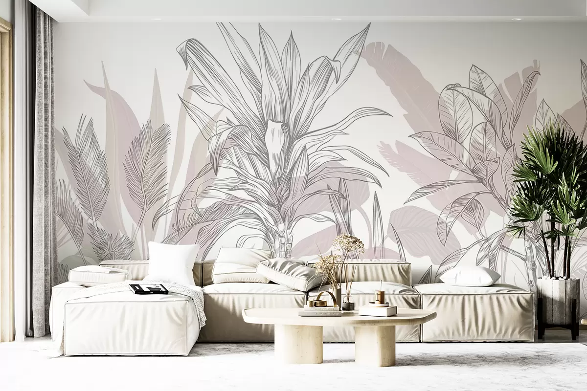 Фототапет Тропически графични растения с големи, пищни листа и цветя в нюанси на сиво и бяло с флорални розови силуети Nr w08327v1