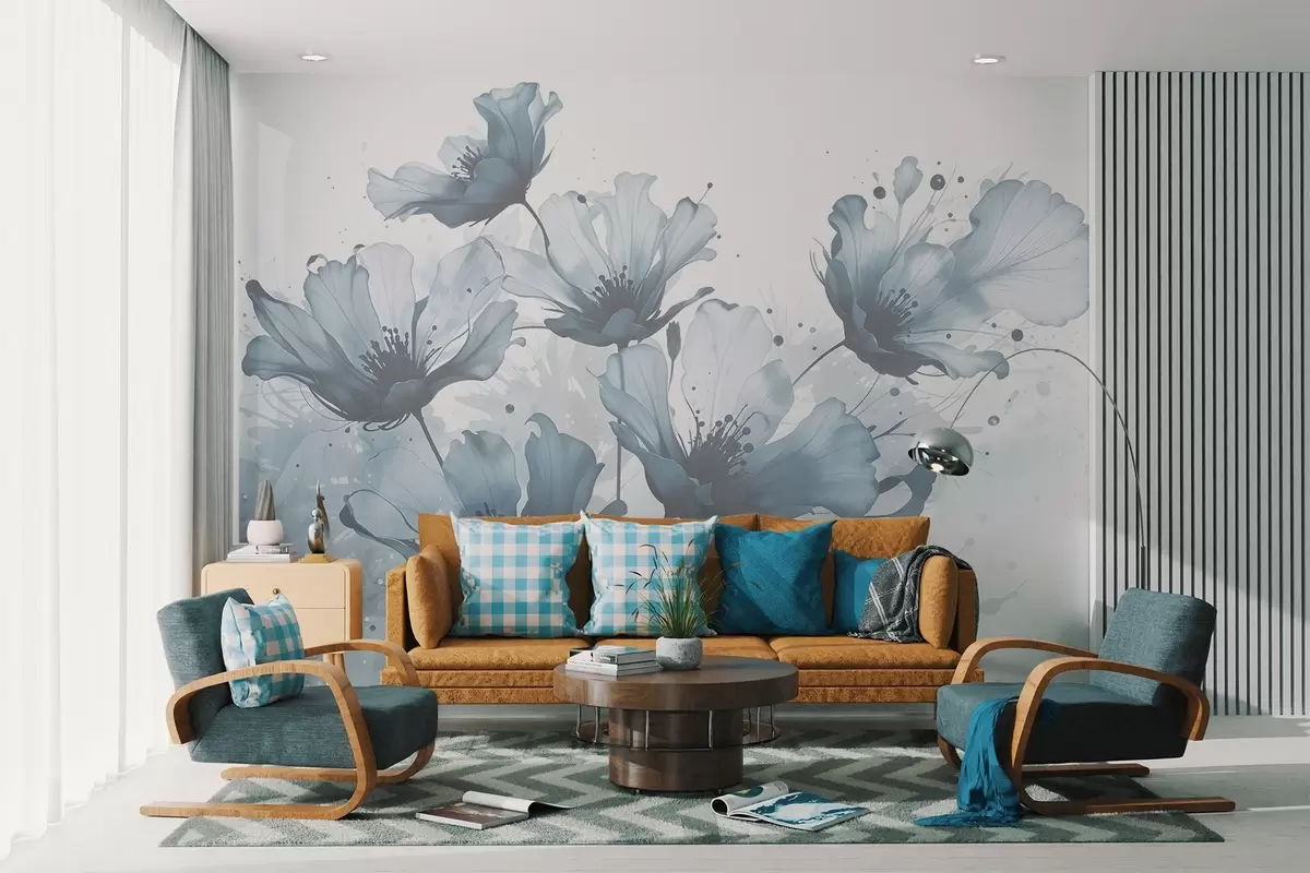 Фототапет Деликатни сини цветя с меки, размити венчелистчета и акварелни пръски на светъл фон Nr w08376