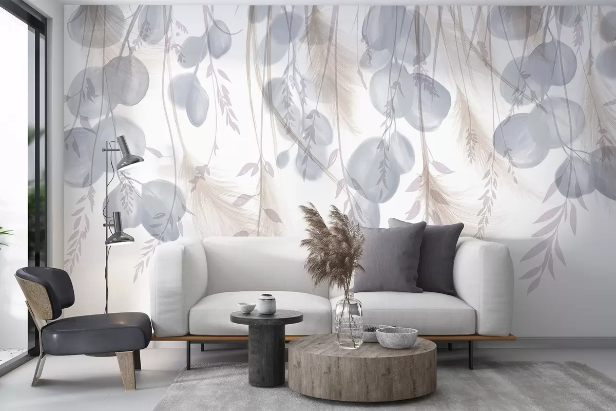 Фототапет Нежни сини и пастелно бежови евкалиптови листа падат, създавайки спокойна и успокояваща атмосфера Nr w08380v1