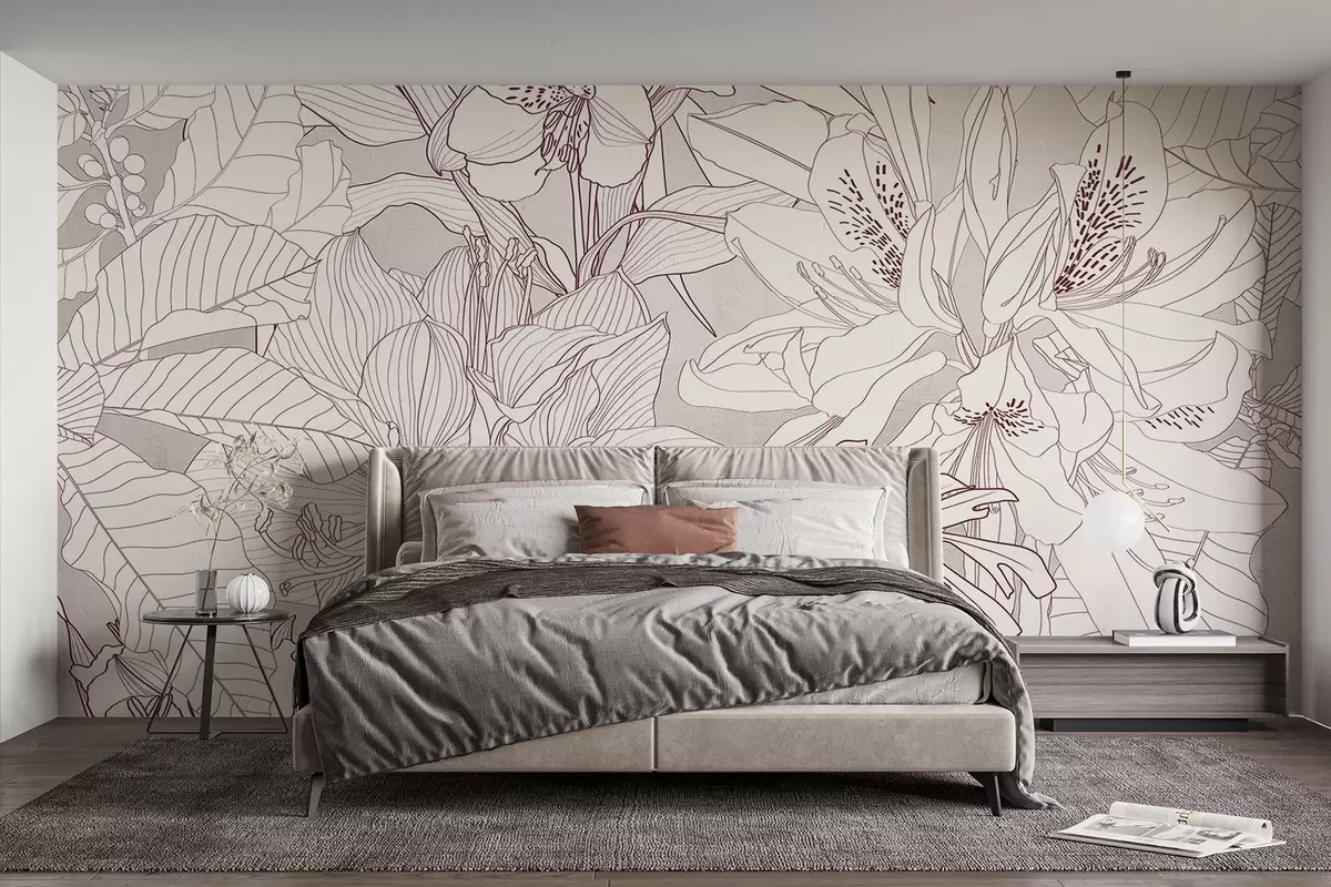 Фототапет Детайлен флорален принт в бордо и сиво с различни видове цветя и листа - пищен, сложен ботанически дизайн Nr w08385