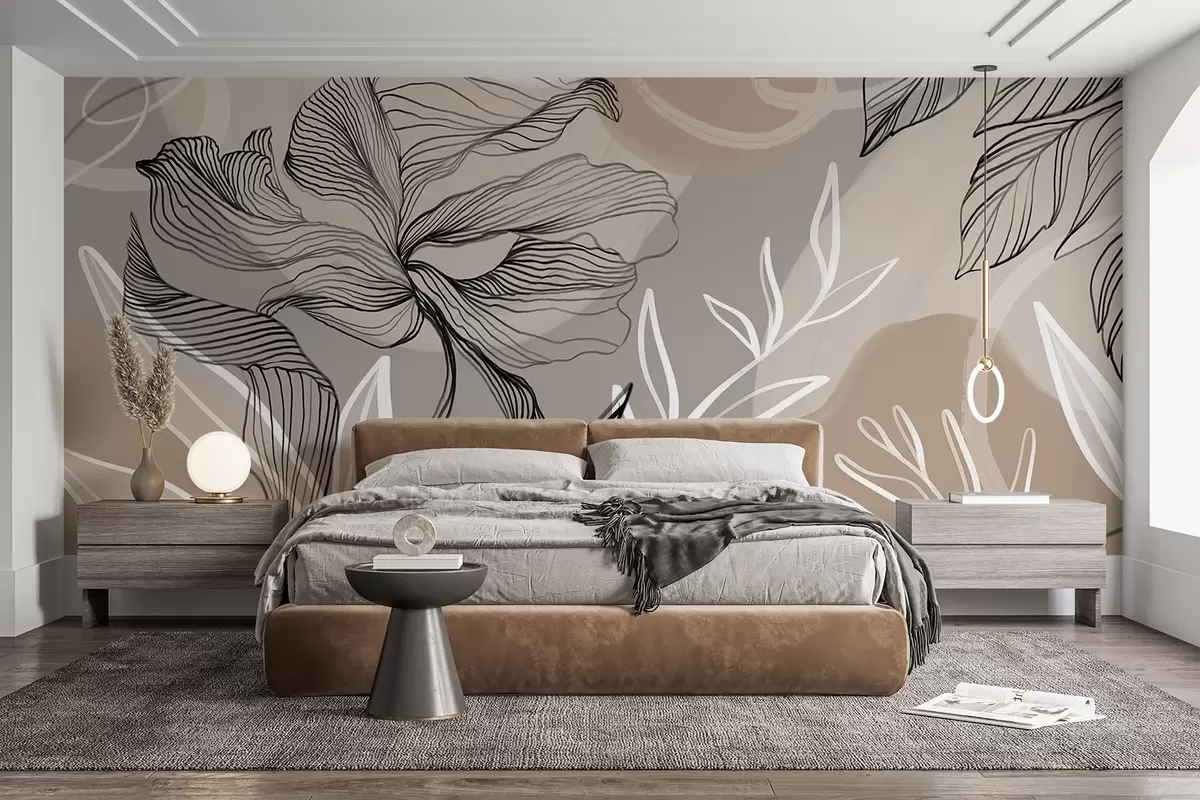 Фототапет Елегантен флорален принт с големи абстрактни цветя и листа в нюанси на сиво и бежово на светъл фон Nr w08413