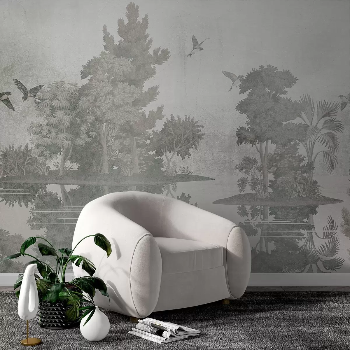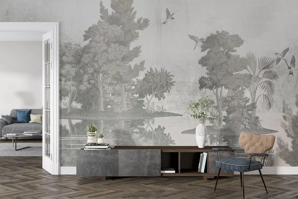 Фототапет Отпечатък на горски пейзаж с езеро, заобиколено от борови дървета и друга зеленина на зелен фон с текстура Nr w08426v1