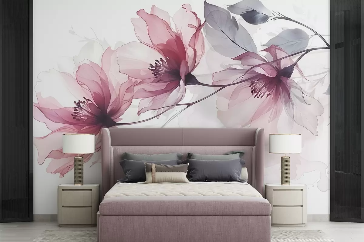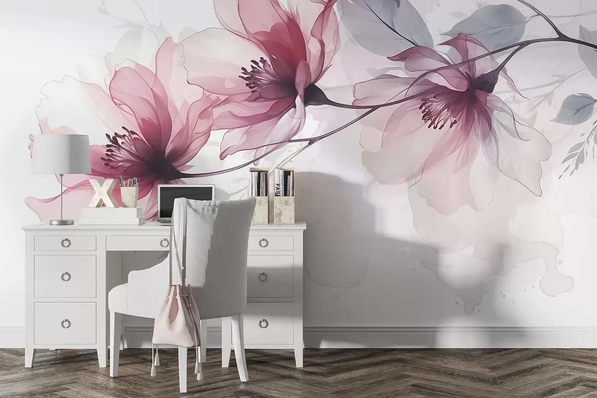 Фототапет Деликатни прозрачни розови и сиви цветя с меки, размазани венчелистчета на бял фон Nr w08429